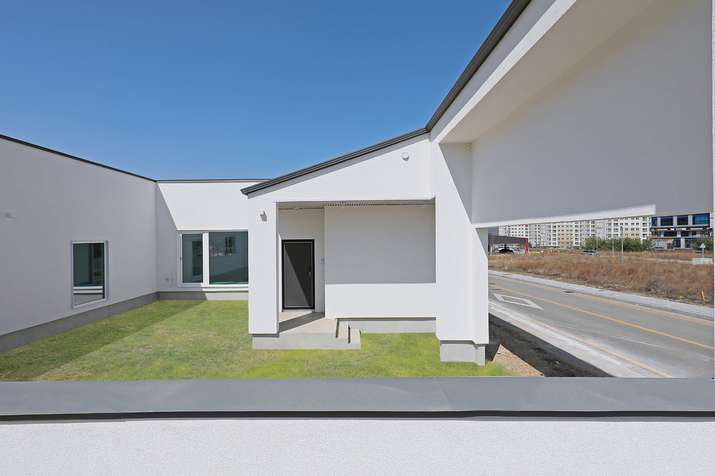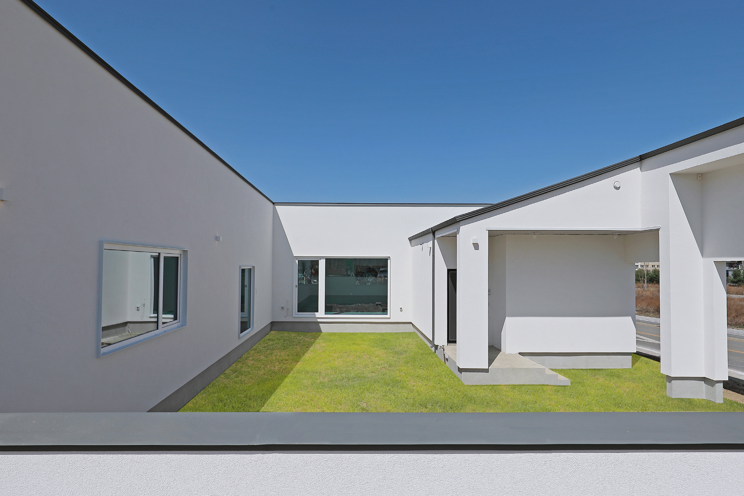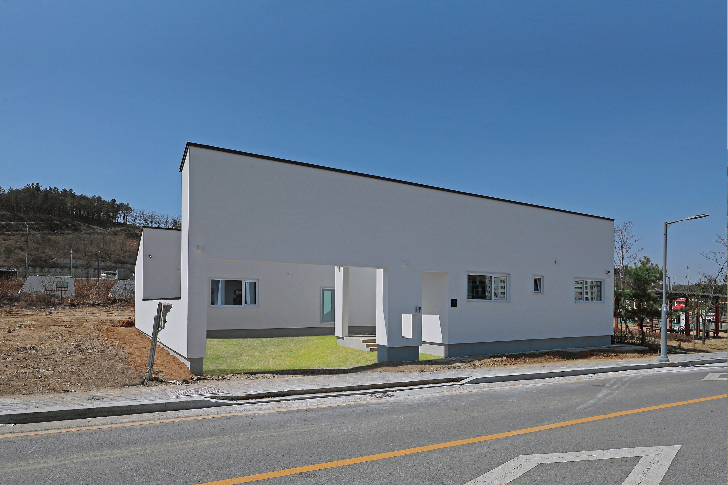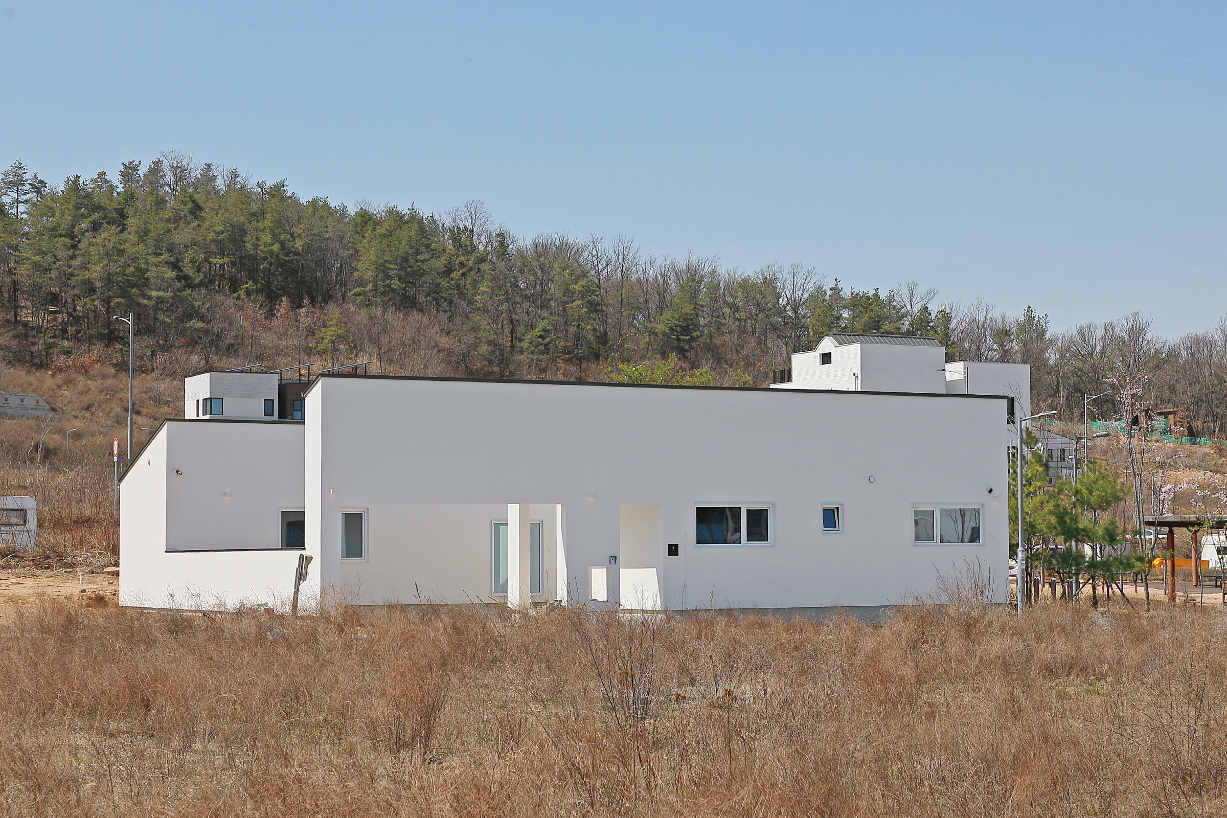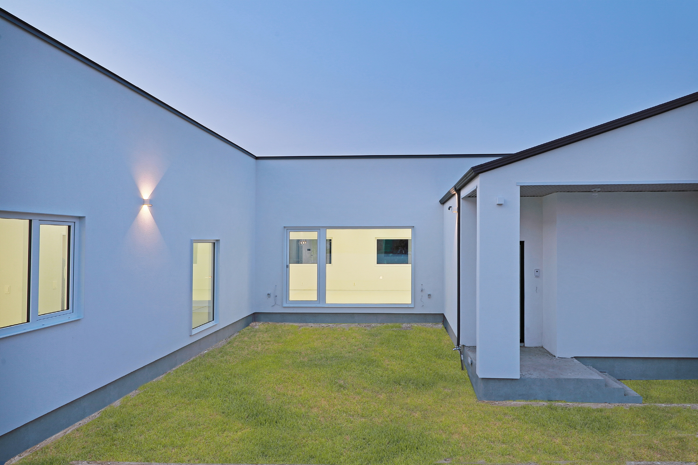 단독 주택부지에 건설된 42평 목조주택이며 외장재는 스타코플렉스, 지붕은 징크시스템창호를 사용하여 건축된 단독주택입니다. 이주택에 특징은 ㄷ자 모양으로 건축되어 마당을 둘러싸여있는 3면 모두가 마당과 연결되어 있어 창호로 들어오는 채광과 개방감을 높이고 독립적인 공간으로 마당을 사용할 수 있습니다.
