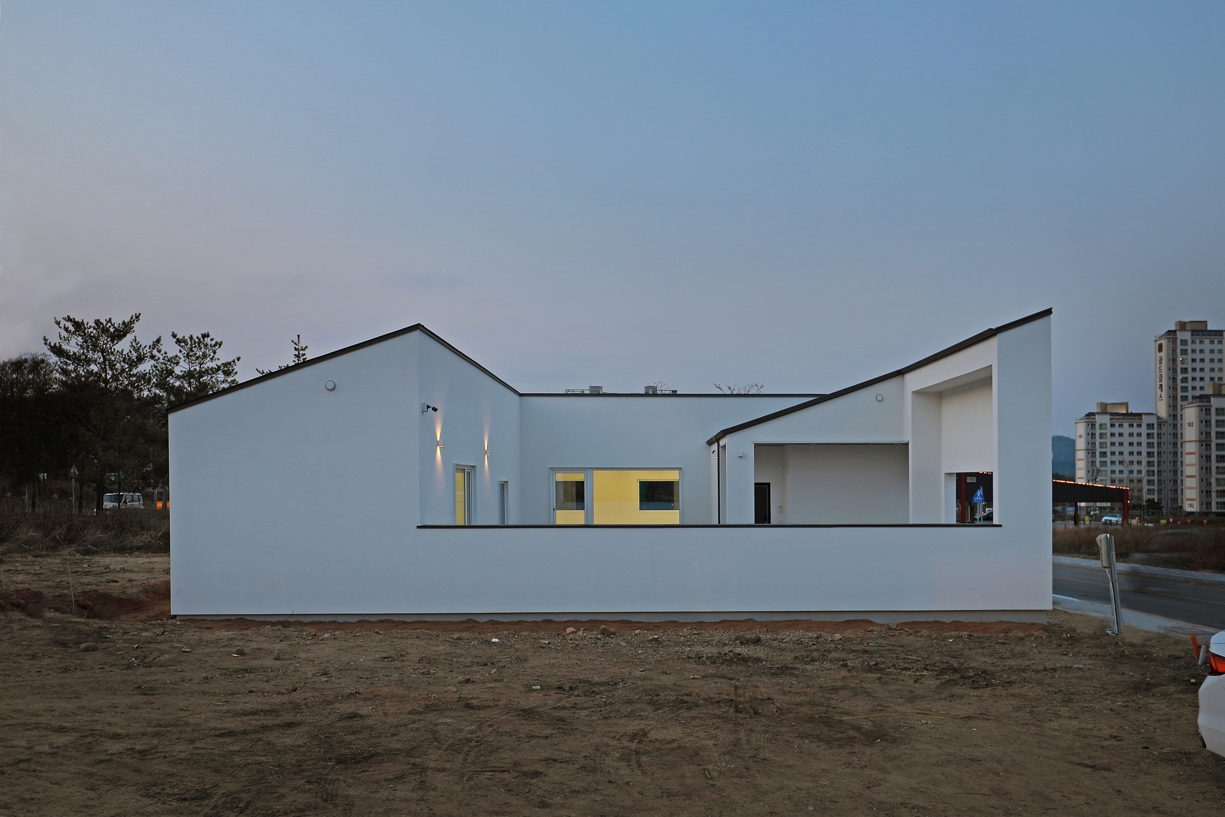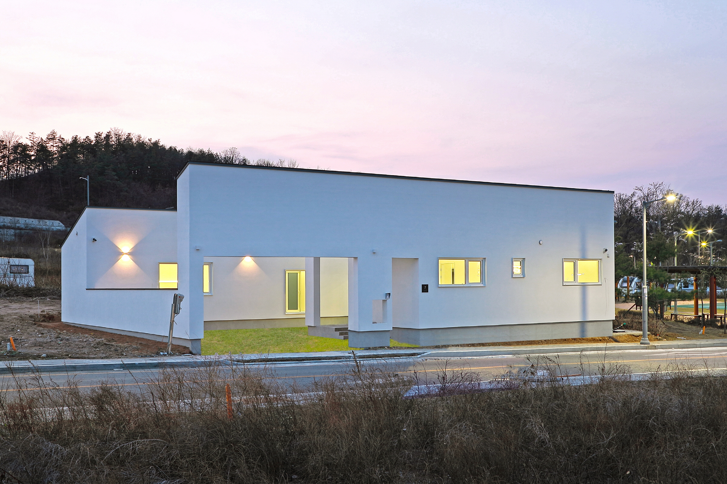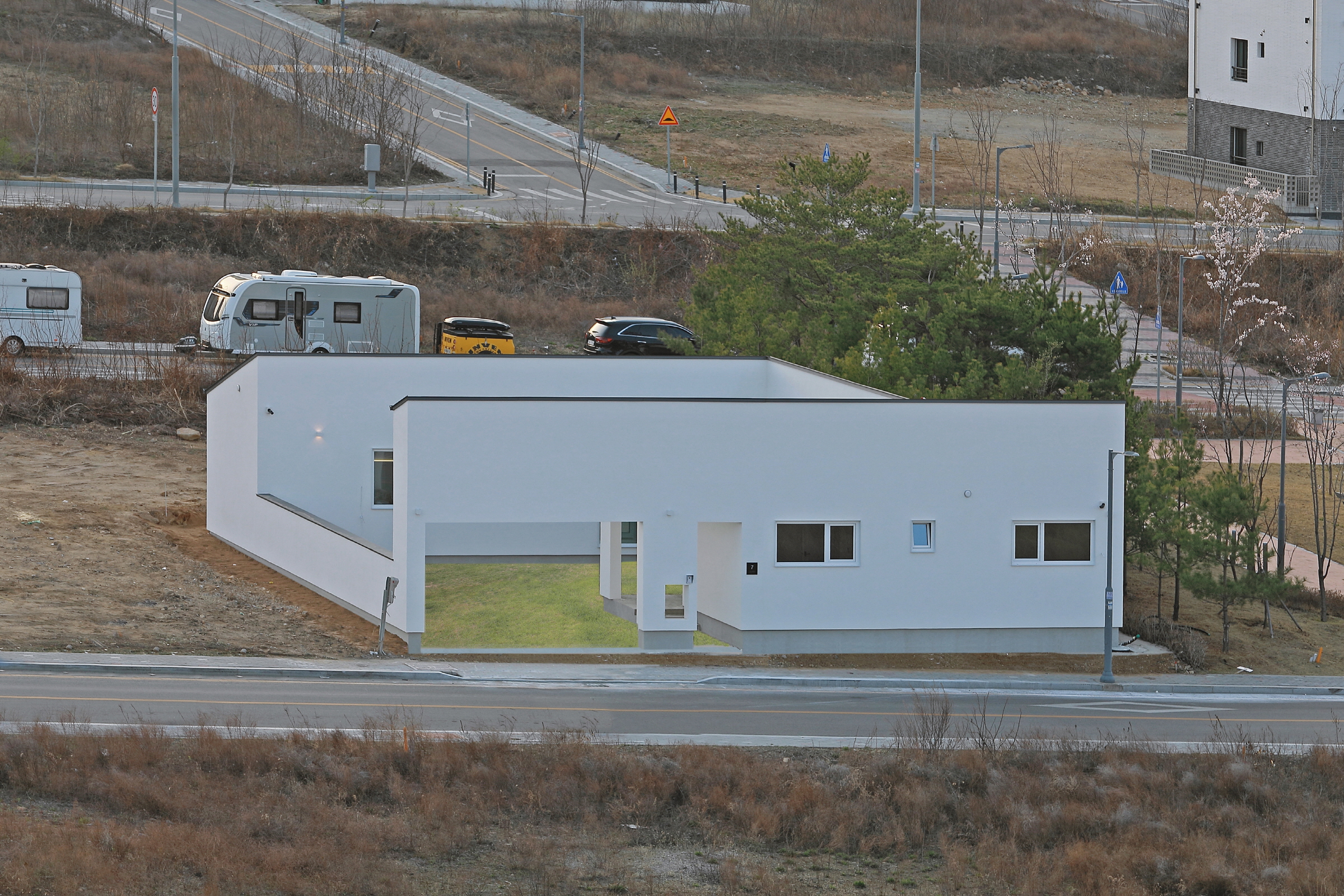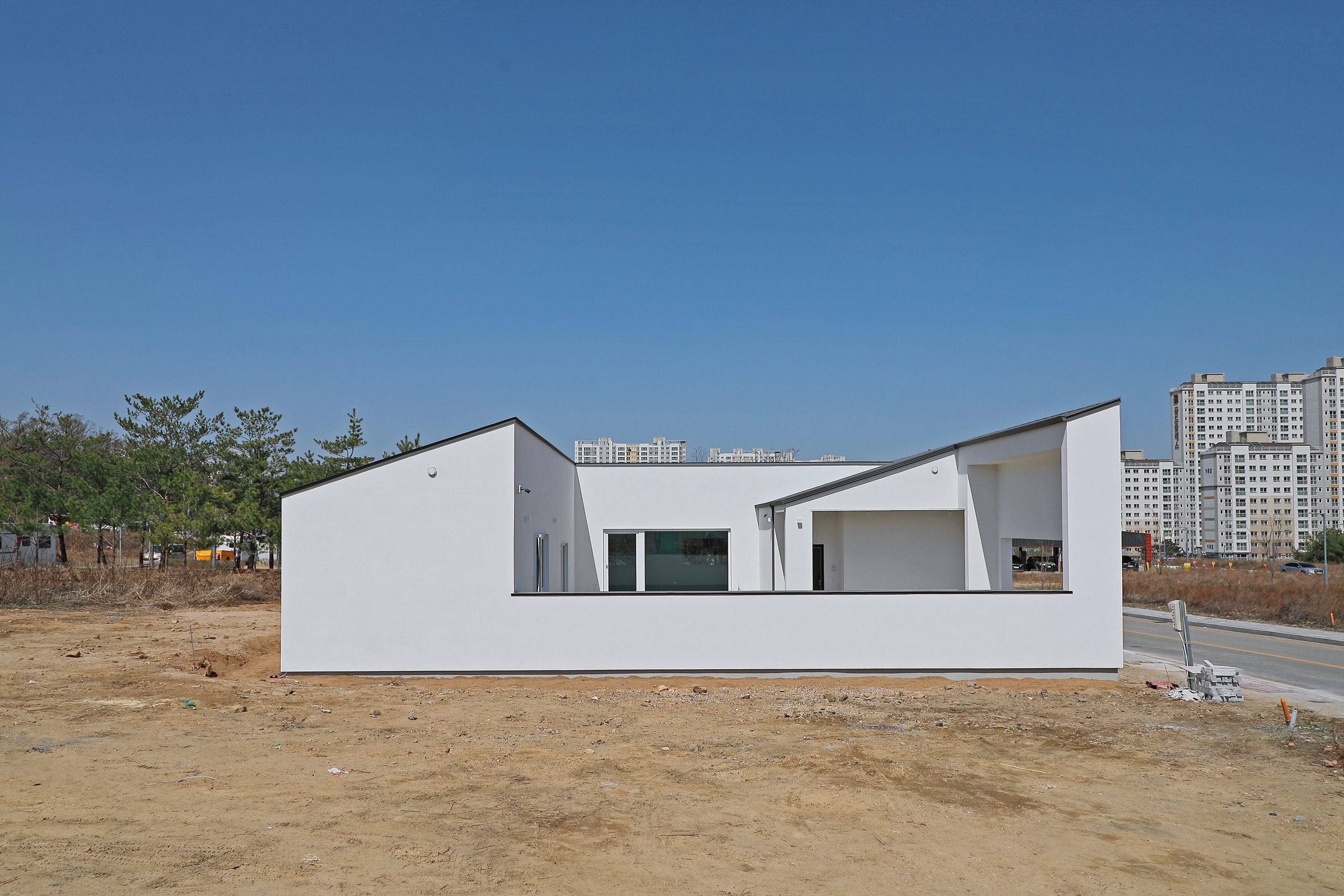 단독 주택부지에 건설된 42평 목조주택이며 외장재는 스타코플렉스, 지붕은 징크시스템창호를 사용하여 건축된 단독주택입니다. 이주택에 특징은 ㄷ자 모양으로 건축되어 마당을 둘러싸여있는 3면 모두가 마당과 연결되어 있어 창호로 들어오는 채광과 개방감을 높이고 독립적인 공간으로 마당을 사용할 수 있습니다.