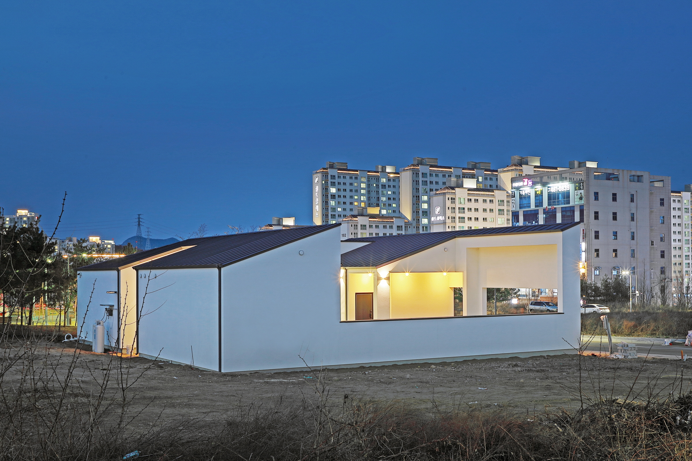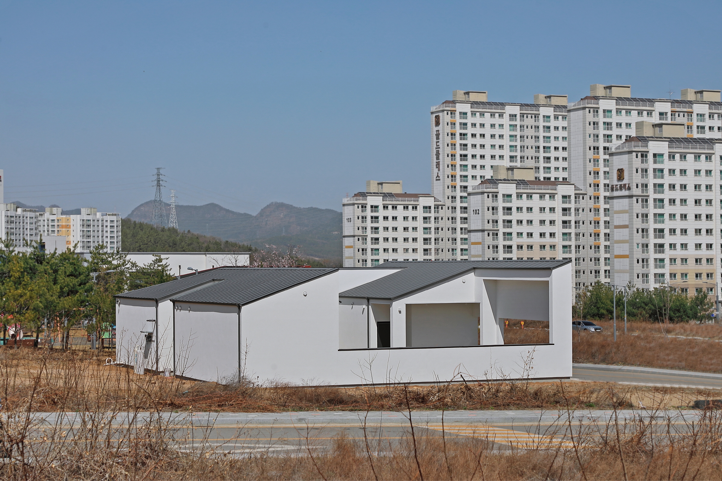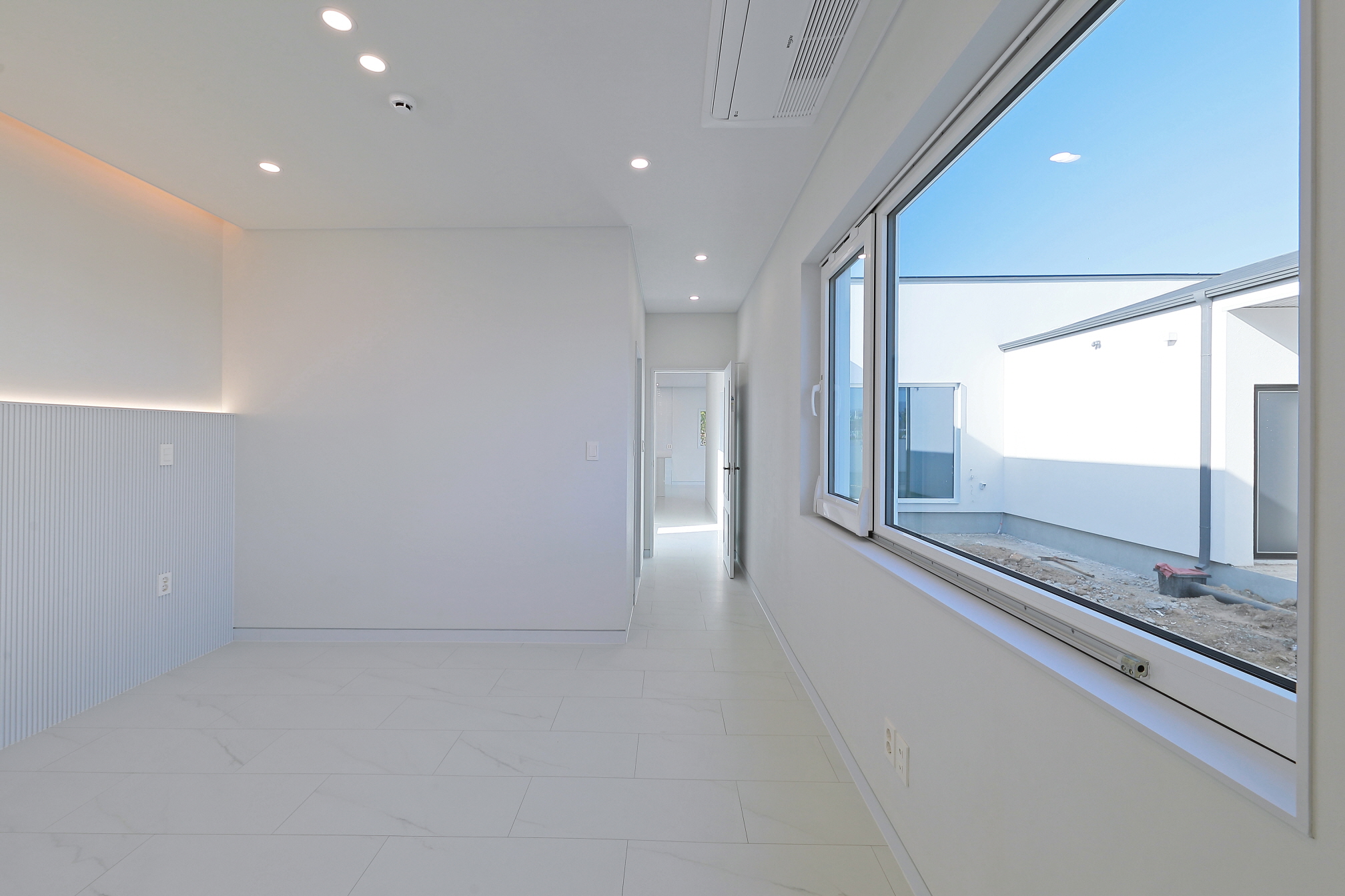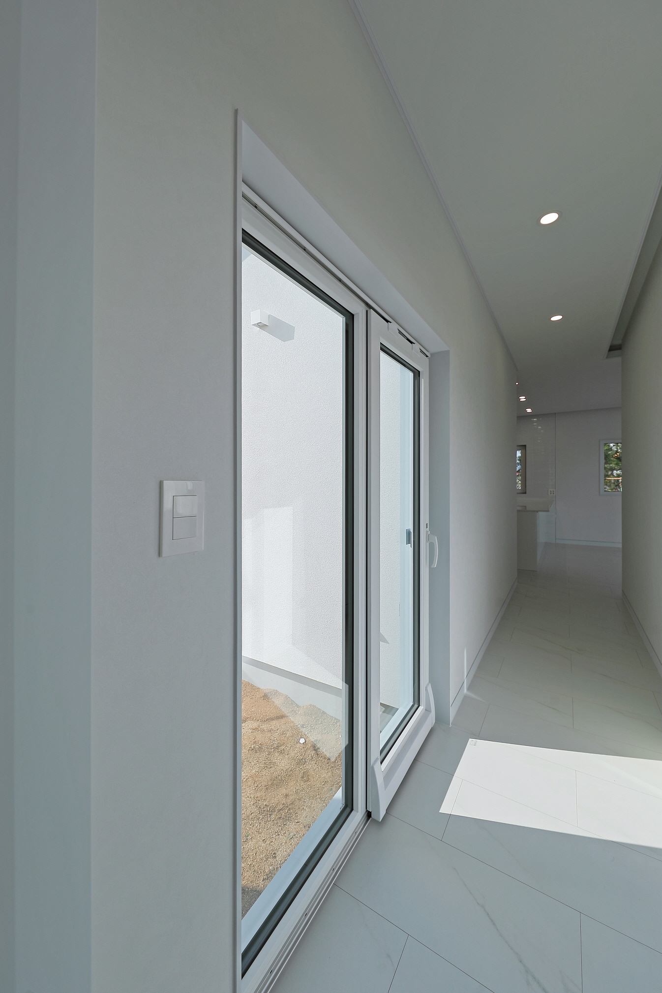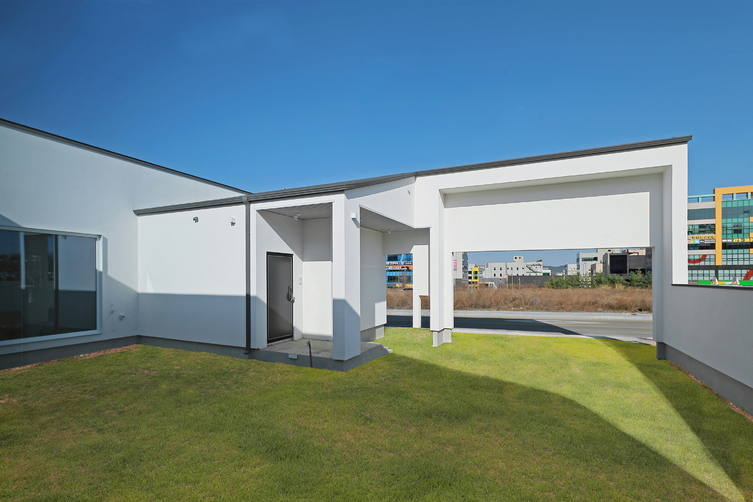 단독 주택부지에 건설된 42평 목조주택이며 외장재는 스타코플렉스, 지붕은 징크시스템창호를 사용하여 건축된 단독주택입니다. 이주택에 특징은 ㄷ자 모양으로 건축되어 마당을 둘러싸여있는 3면 모두가 마당과 연결되어 있어 창호로 들어오는 채광과 개방감을 높이고 독립적인 공간으로 마당을 사용할 수 있습니다.