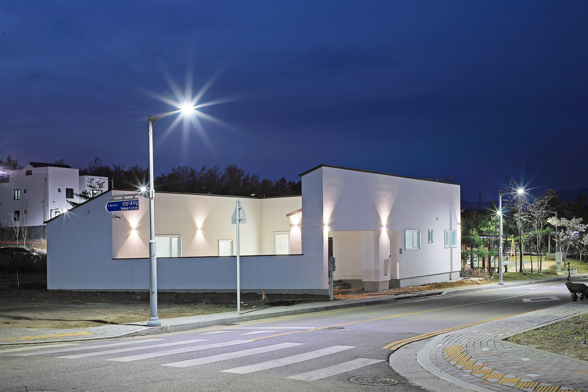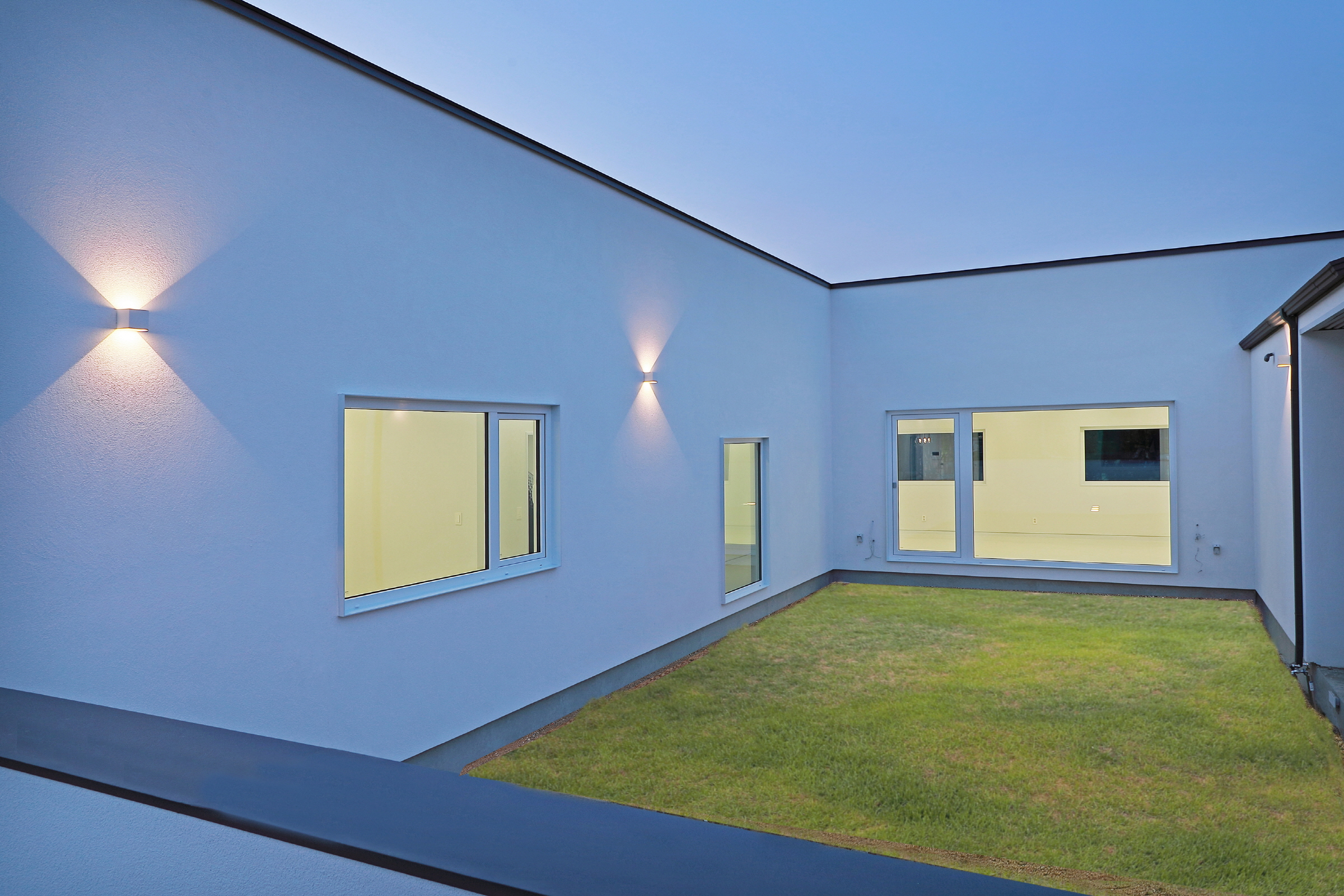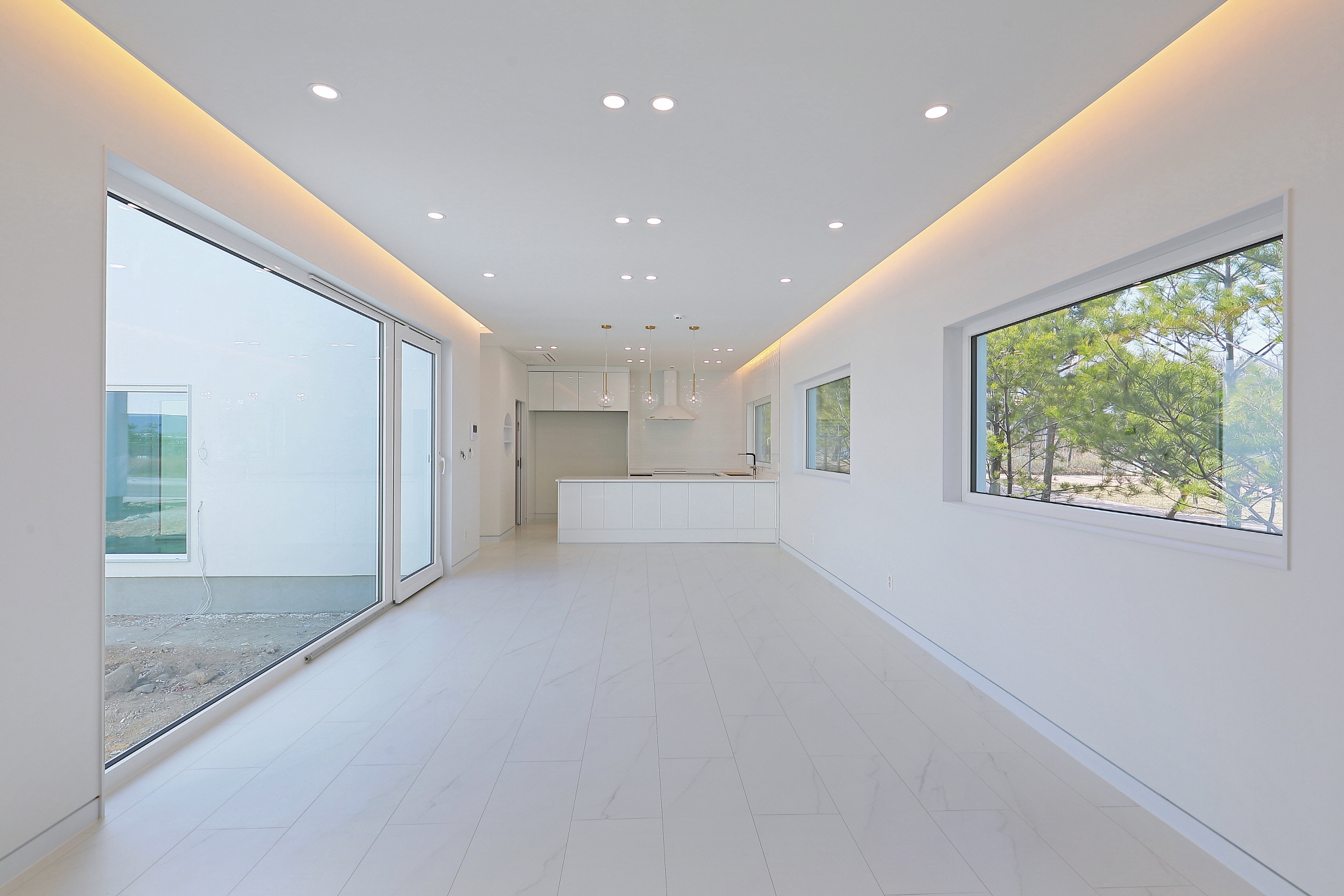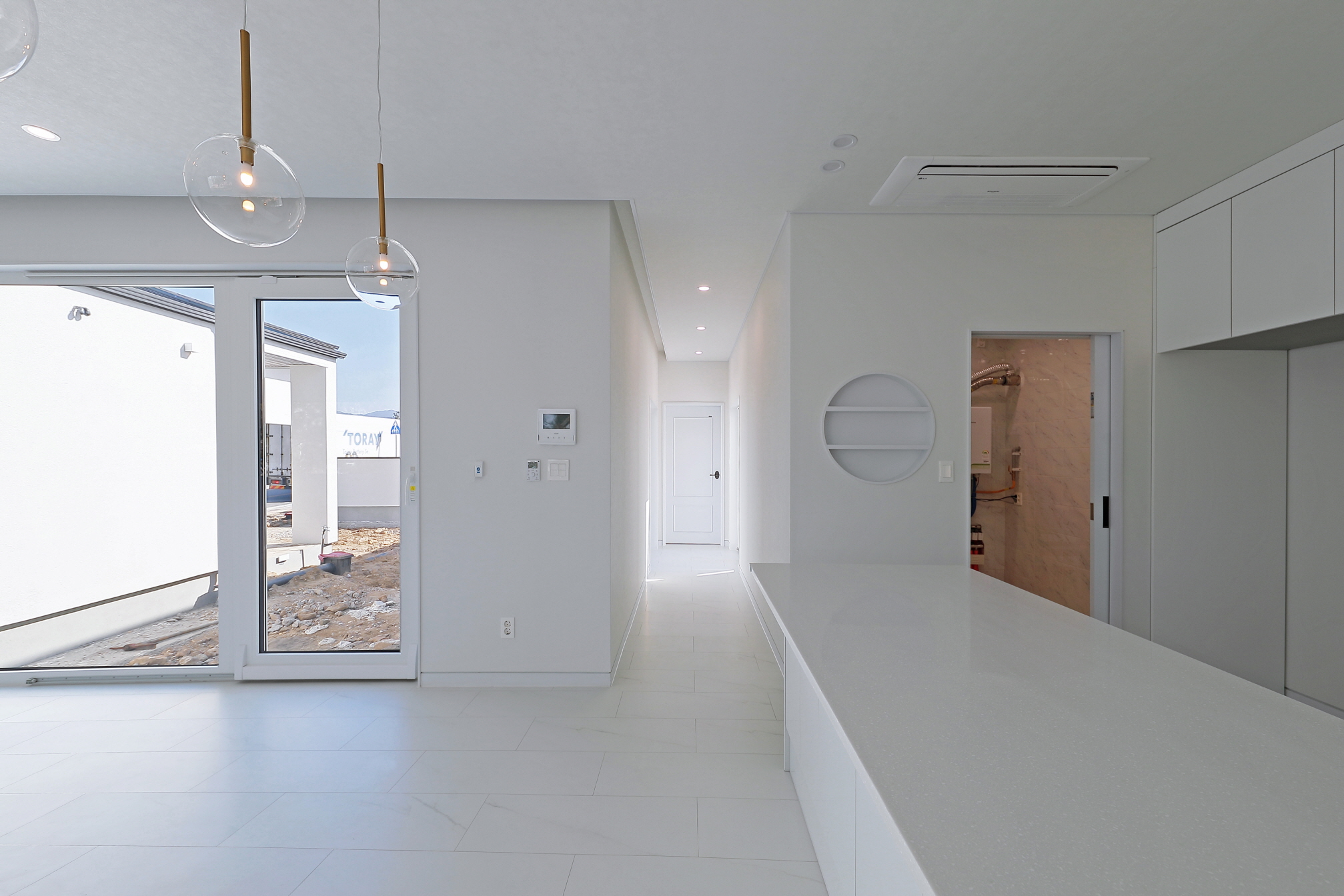 단독 주택부지에 건설된 42평 목조주택이며 외장재는 스타코플렉스, 지붕은 징크시스템창호를 사용하여 건축된 단독주택입니다. 이주택에 특징은 ㄷ자 모양으로 건축되어 마당을 둘러싸여있는 3면 모두가 마당과 연결되어 있어 창호로 들어오는 채광과 개방감을 높이고 독립적인 공간으로 마당을 사용할 수 있습니다.