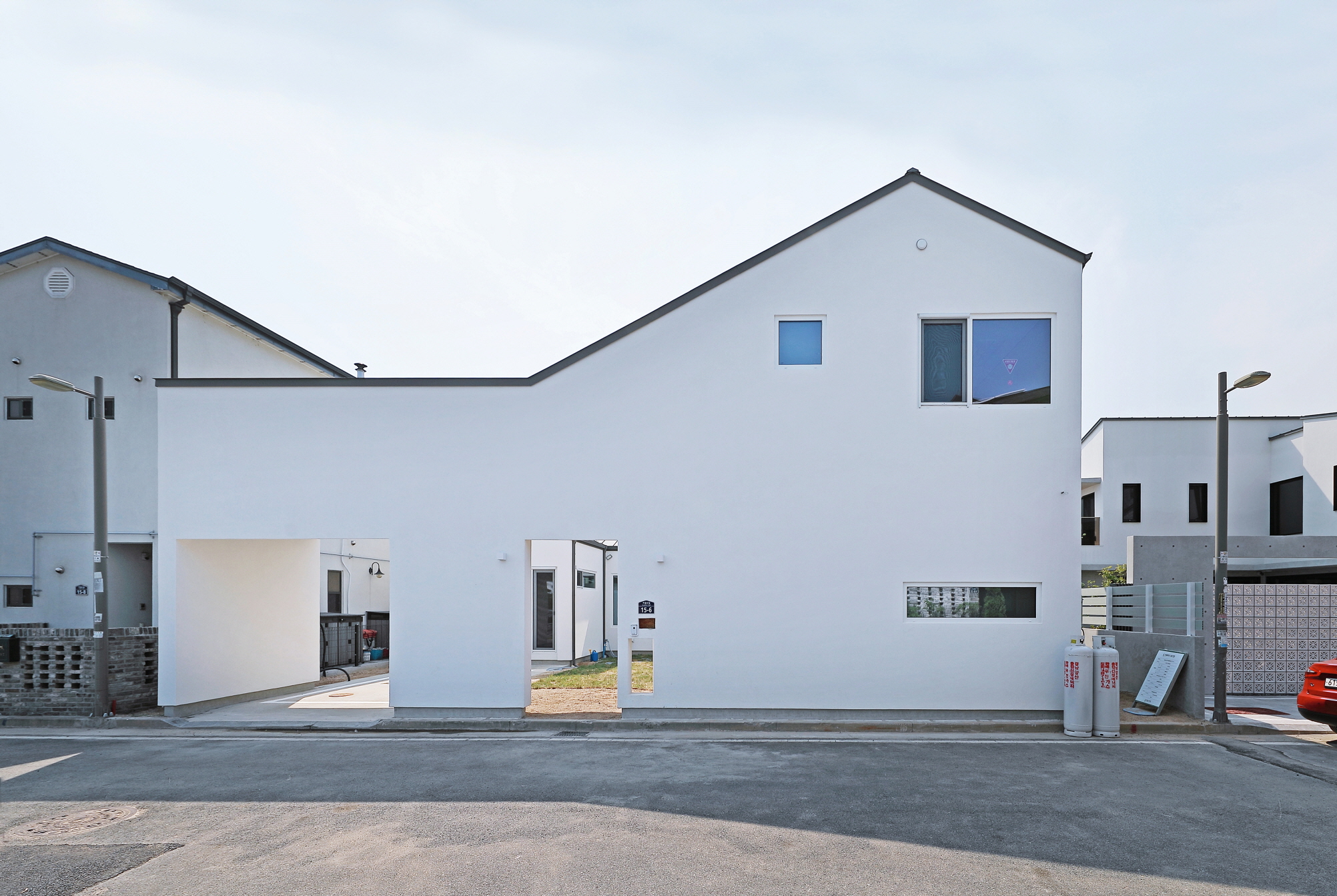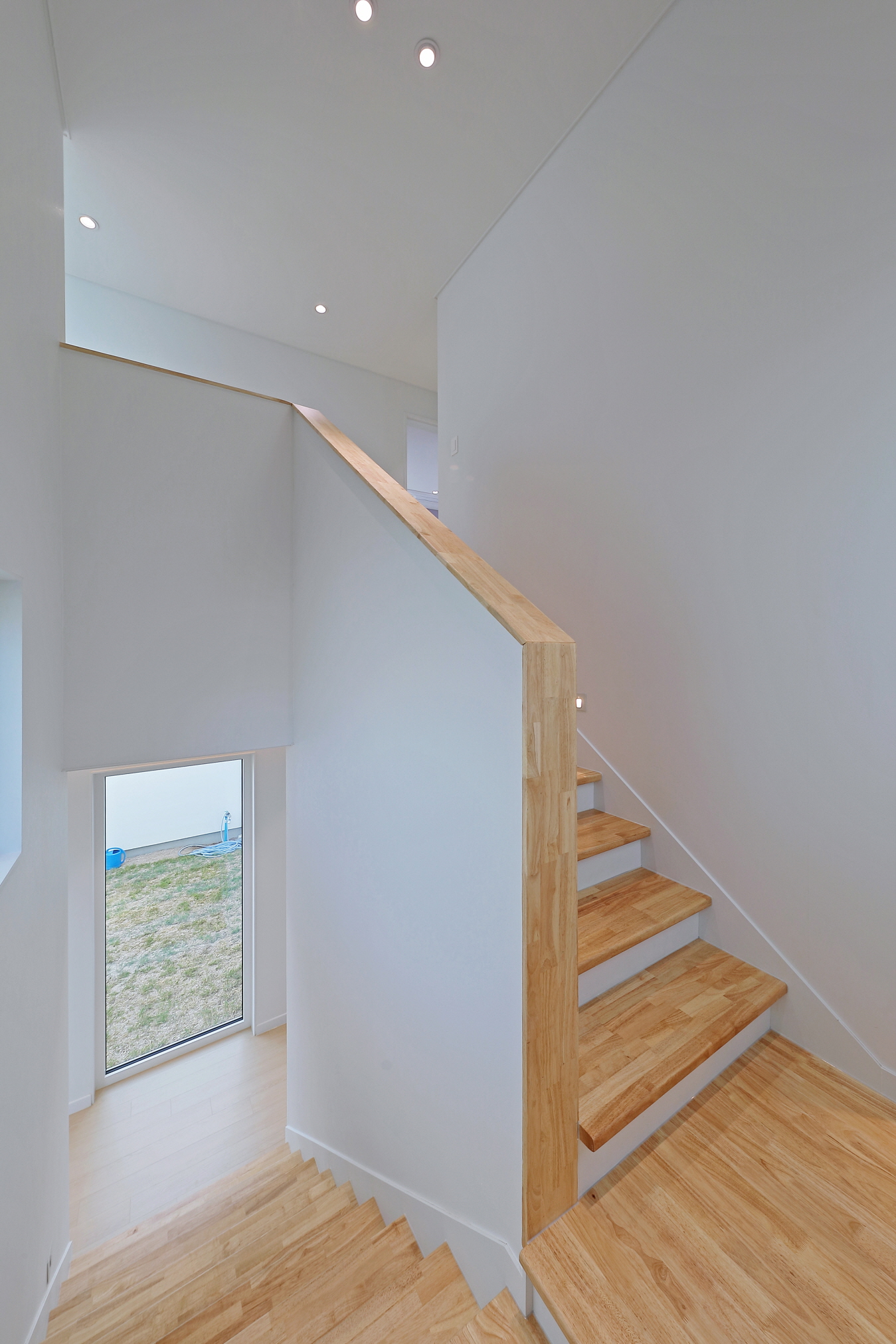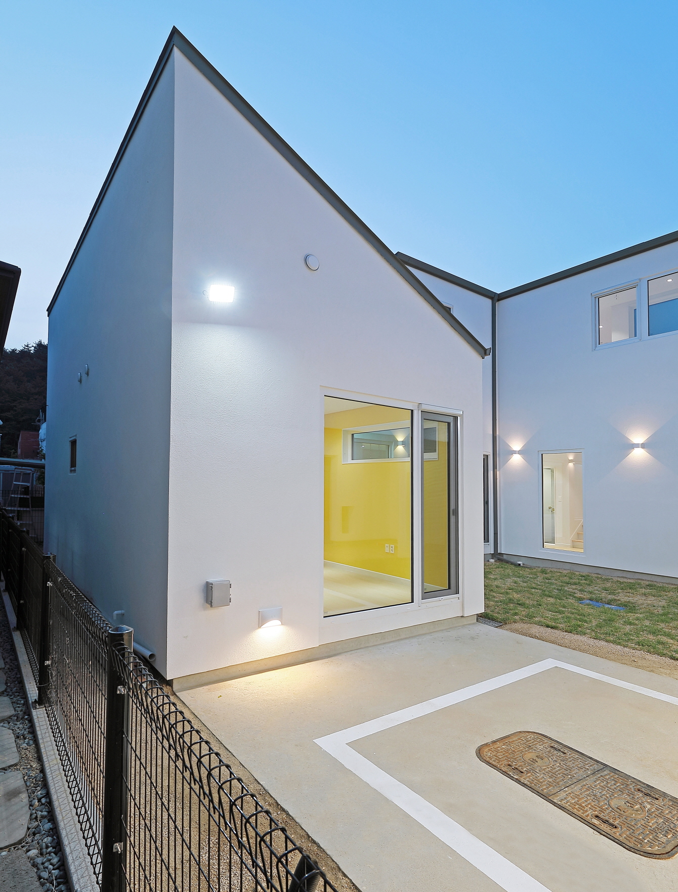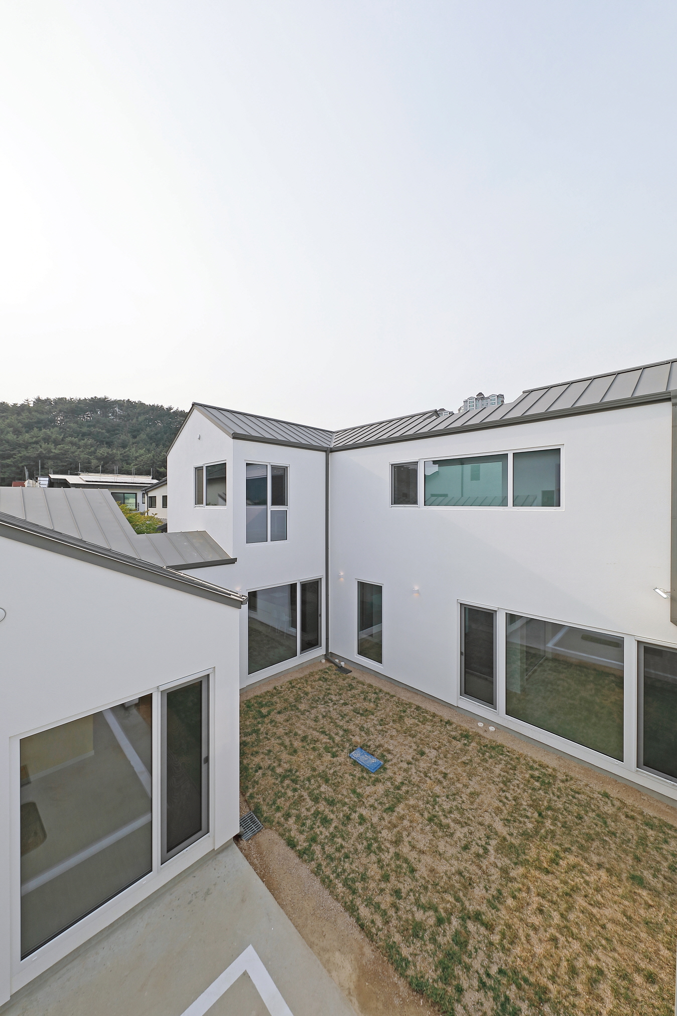 단독 주택부지에 건설된 60평 목조주택이며 외장재는 스타코플렉스, 지붕은 징크, 시스템창호를 사용하여 건축된 단독주택입니다. 이주택에 특징은 ㄷ자 모양으로 건축되어 마당을 둘러싸여있는 3면 모두가 마당과 연결되어 있어 창호로 들어오는 채광과 개방감을 높이고 독립적인 공간으로 마당을 사용할 수 있습니다. 또한 2층 내부에서 2층 테라스로 연결되어 있으며 2층테라스외부를 막아 개인공간으로 활용할 수 있습니다.