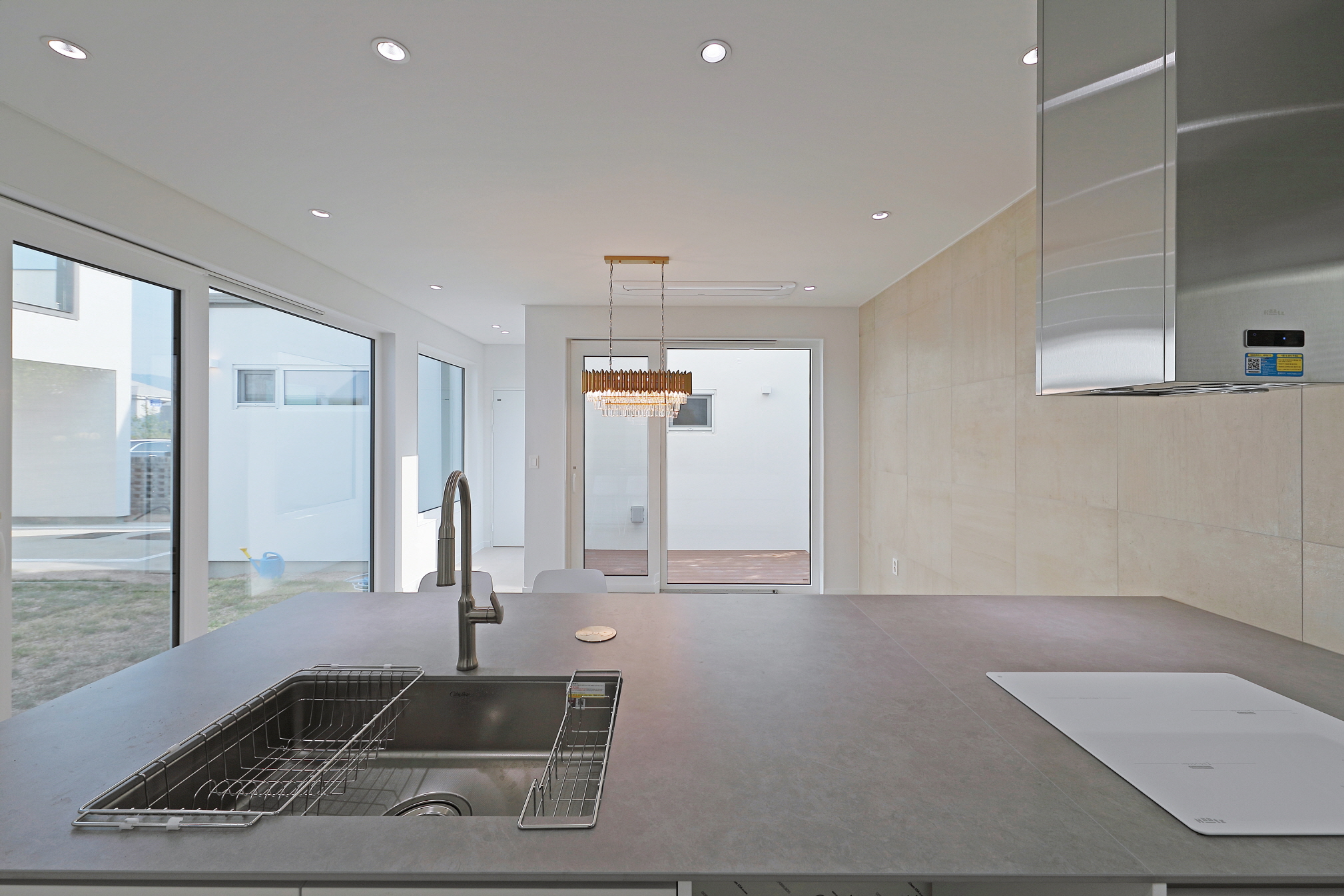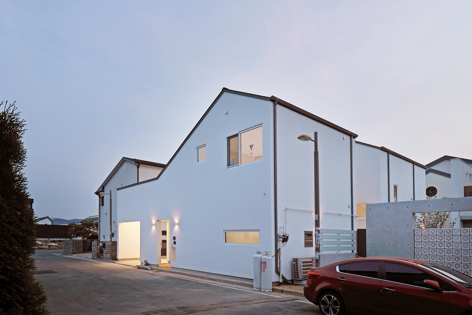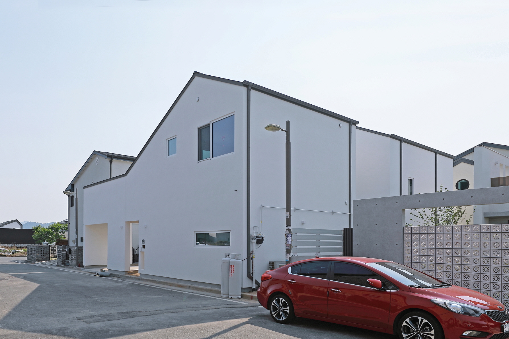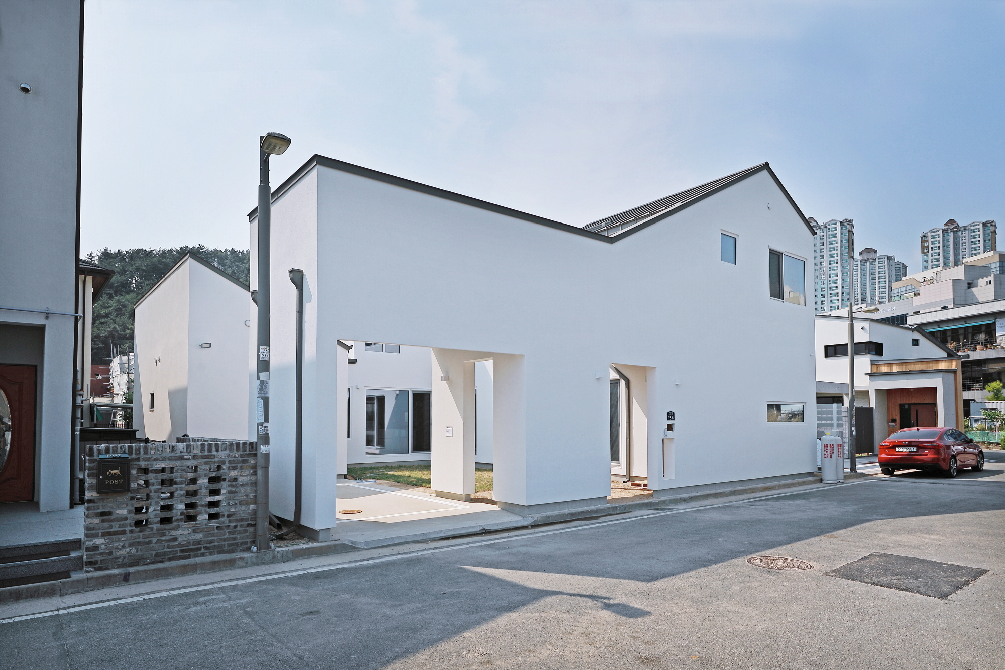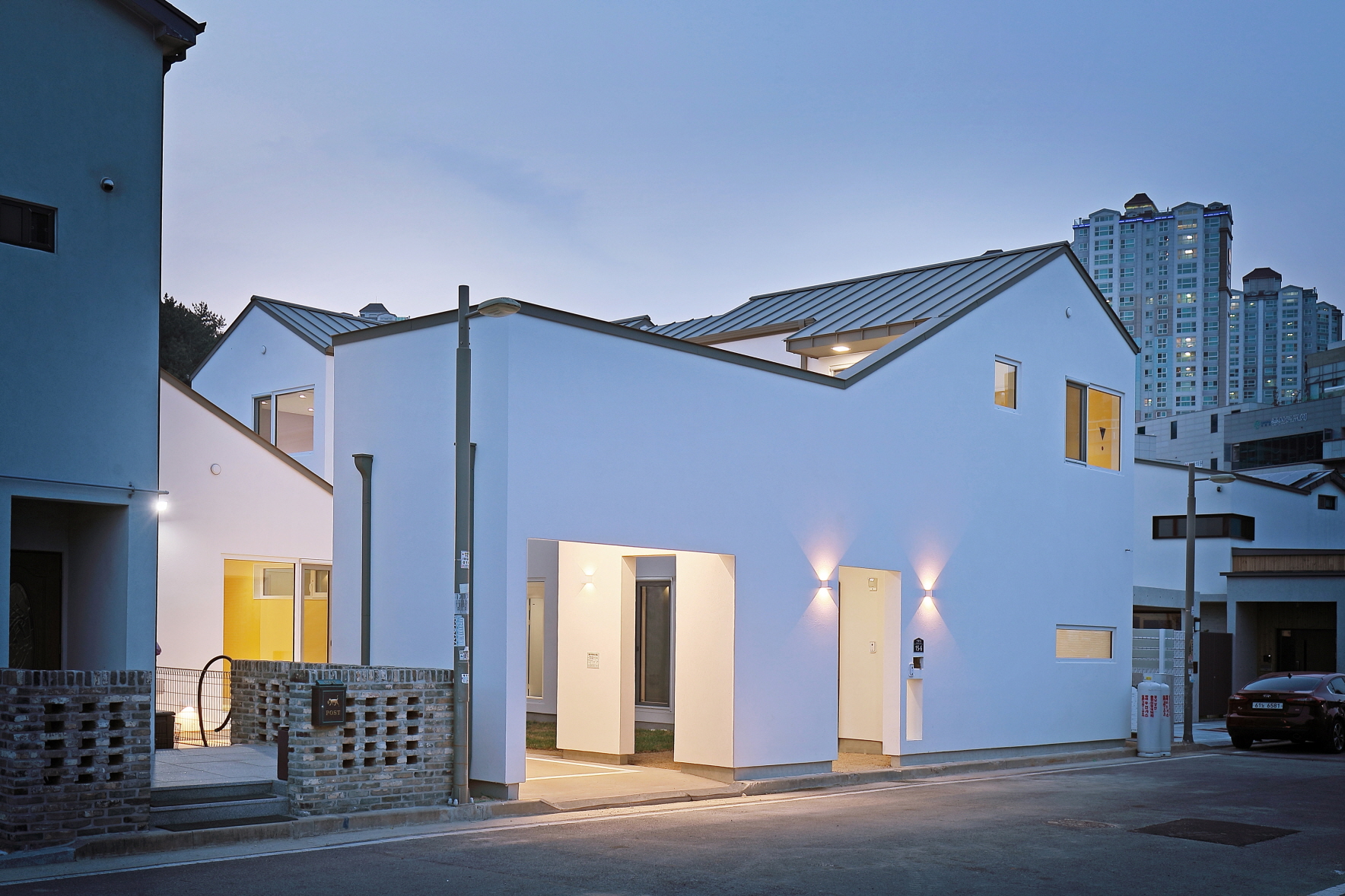 단독 주택부지에 건설된 60평 목조주택이며 외장재는 스타코플렉스, 지붕은 징크, 시스템창호를 사용하여 건축된 단독주택입니다. 이주택에 특징은 ㄷ자 모양으로 건축되어 마당을 둘러싸여있는 3면 모두가 마당과 연결되어 있어 창호로 들어오는 채광과 개방감을 높이고 독립적인 공간으로 마당을 사용할 수 있습니다. 또한 2층 내부에서 2층 테라스로 연결되어 있으며 2층테라스외부를 막아 개인공간으로 활용할 수 있습니다.