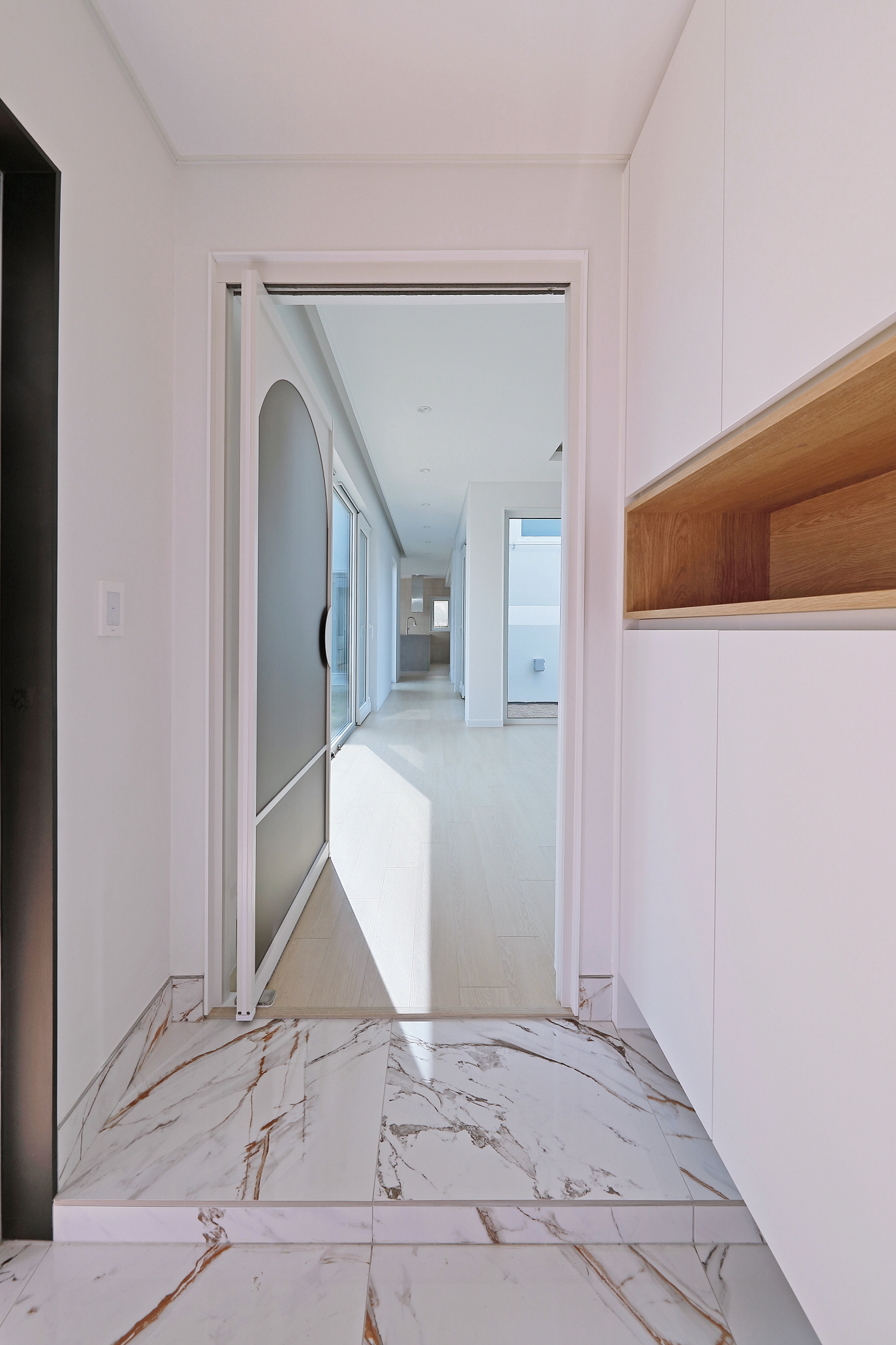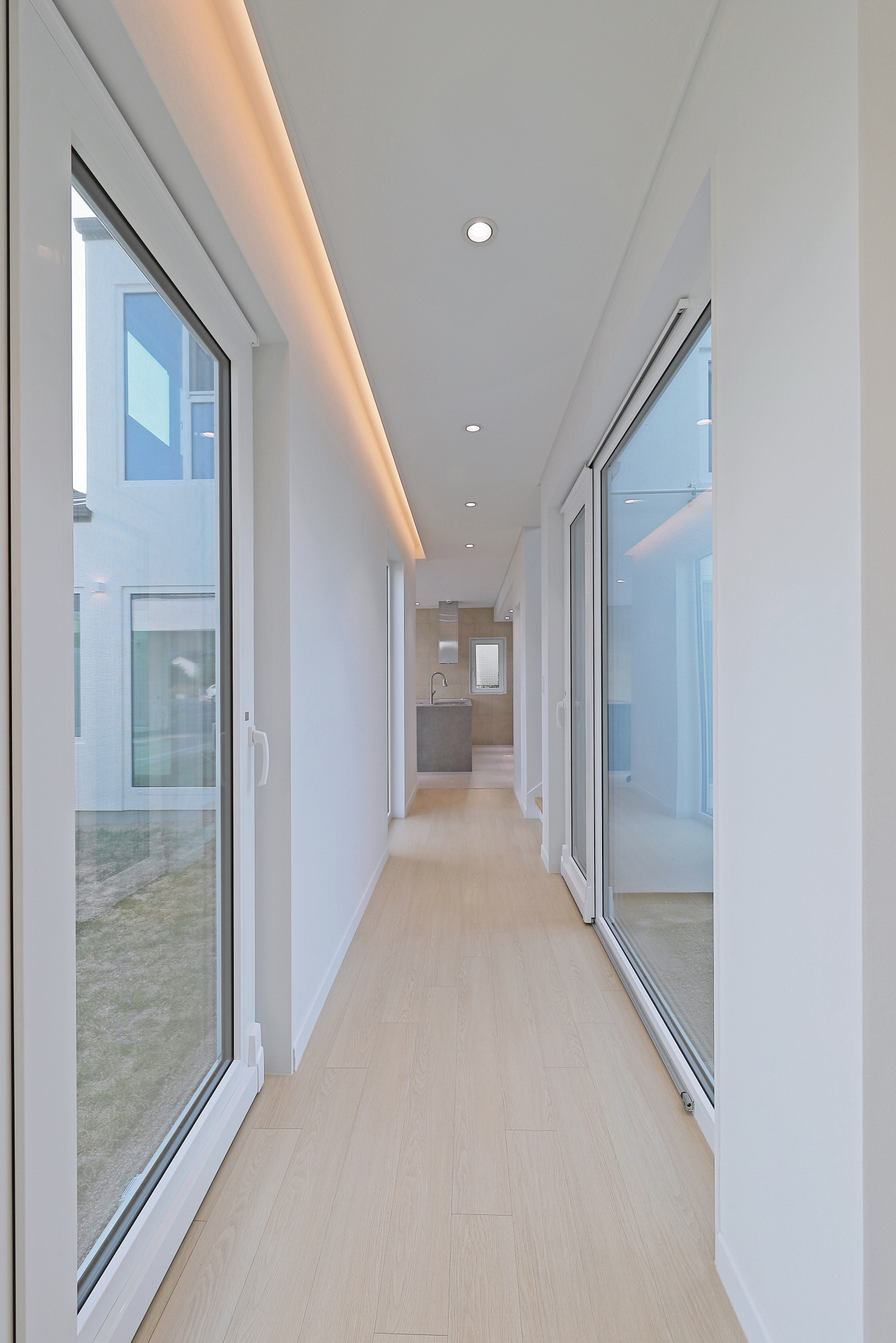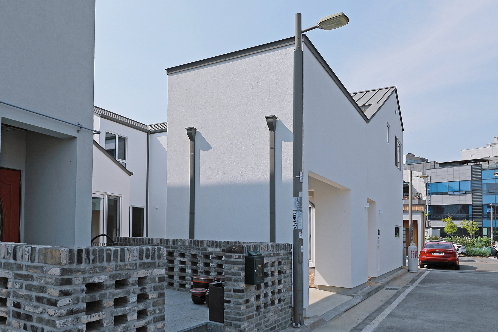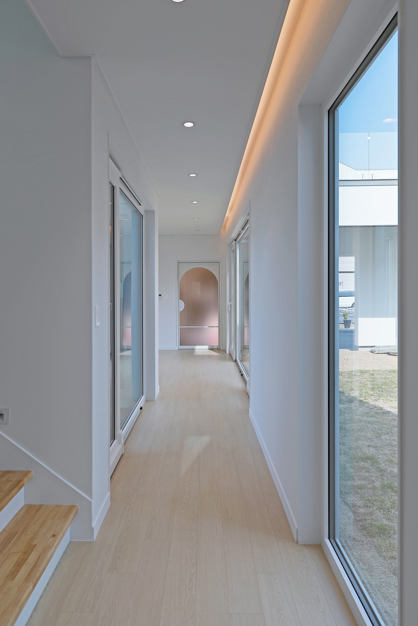 단독 주택부지에 건설된 60평 목조주택이며 외장재는 스타코플렉스, 지붕은 징크, 시스템창호를 사용하여 건축된 단독주택입니다. 이주택에 특징은 ㄷ자 모양으로 건축되어 마당을 둘러싸여있는 3면 모두가 마당과 연결되어 있어 창호로 들어오는 채광과 개방감을 높이고 독립적인 공간으로 마당을 사용할 수 있습니다. 또한 2층 내부에서 2층 테라스로 연결되어 있으며 2층테라스외부를 막아 개인공간으로 활용할 수 있습니다.