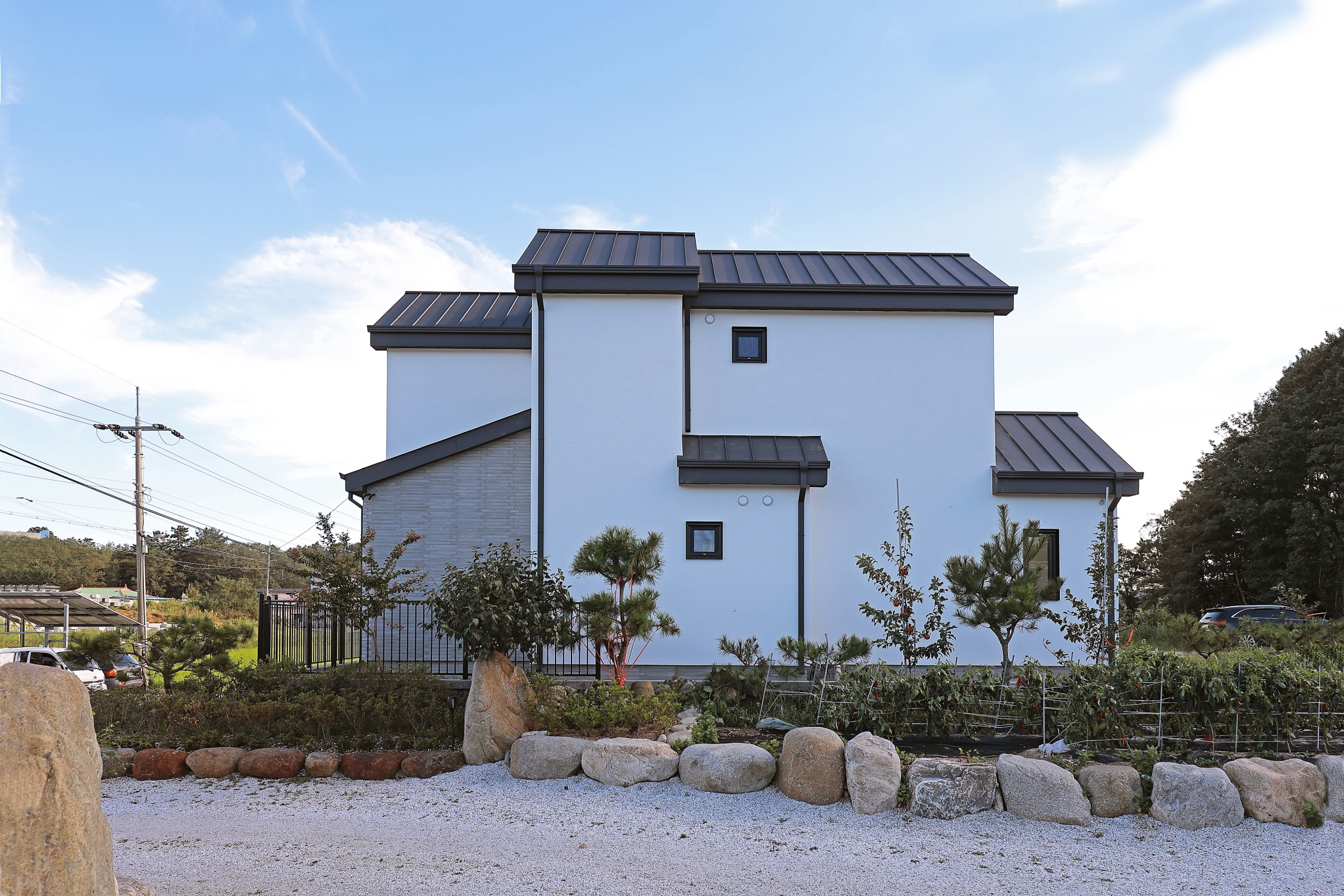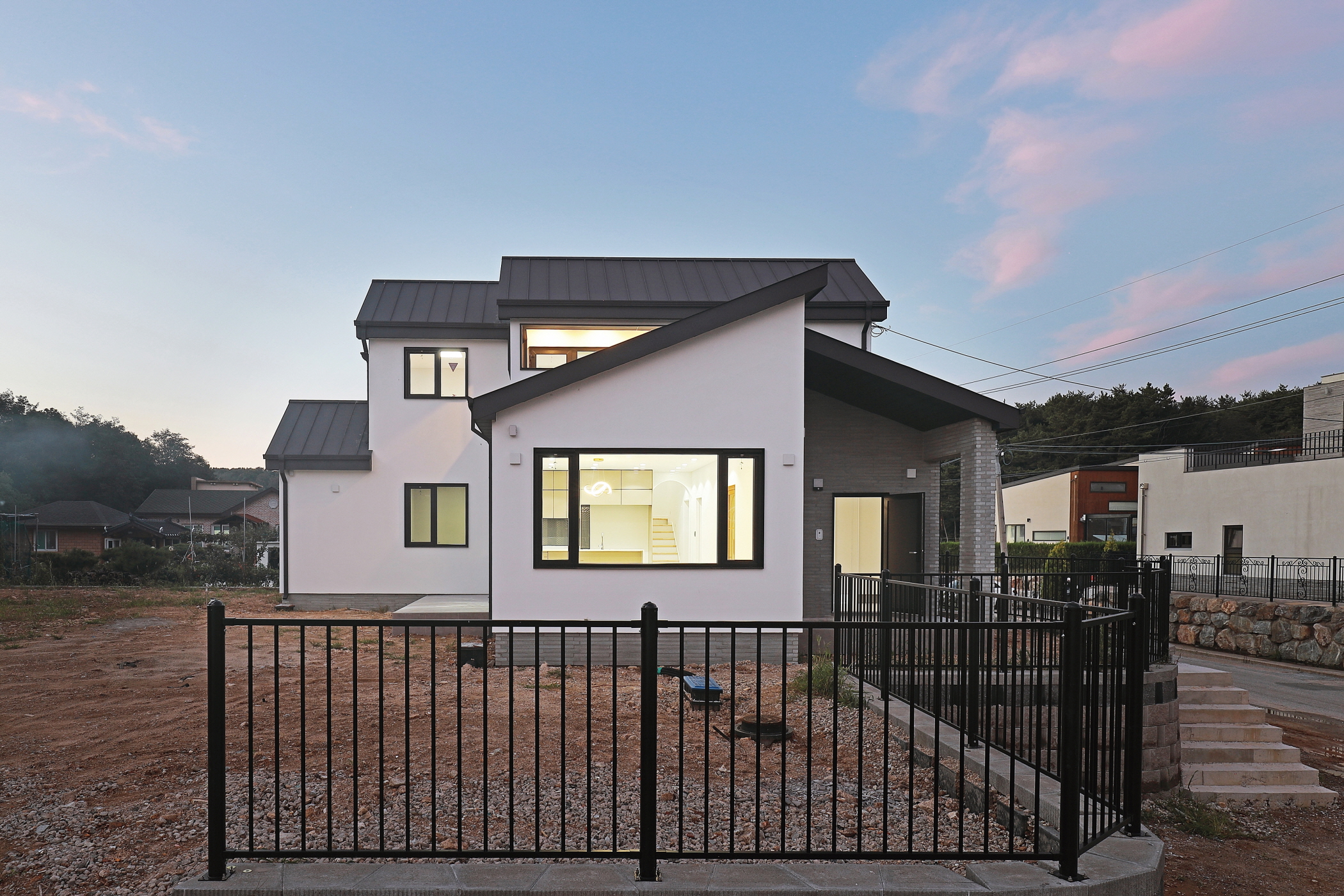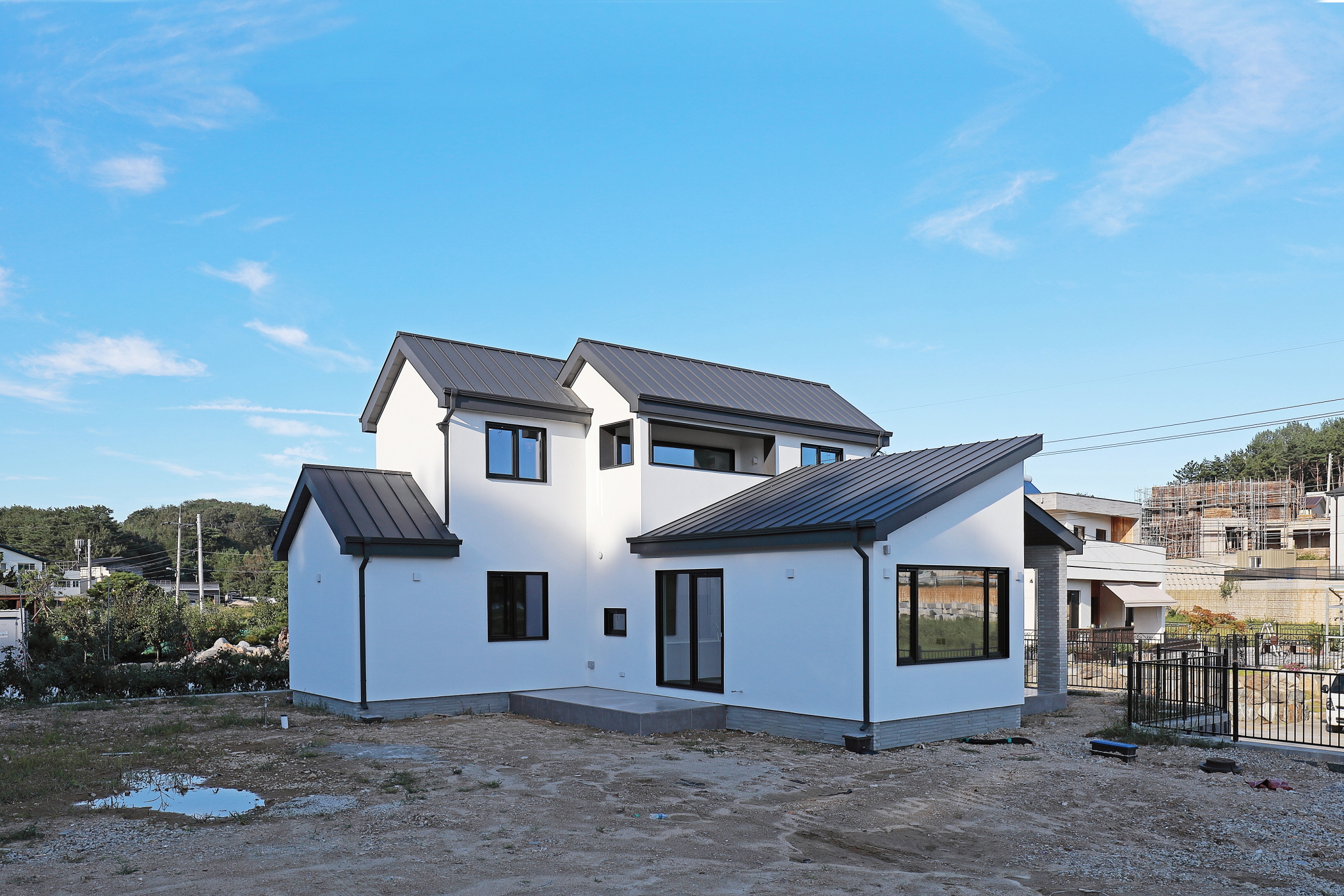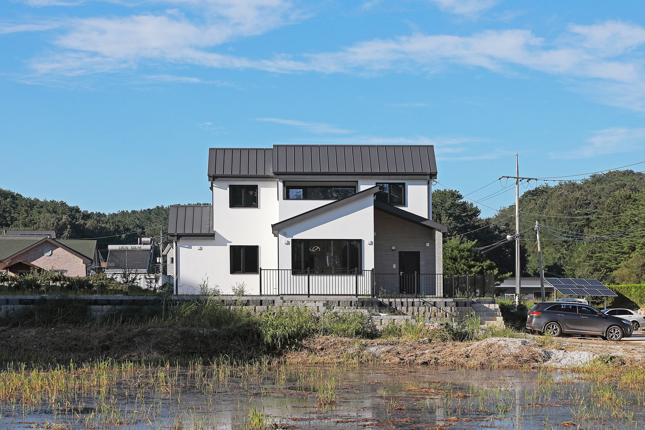 한적한 마을에 건축된 45평 2층 목조주택으로 외부재 스타코플렉스, 롱브릭타일, 지붕은 징크, 시스템 창호를 사용하여 건축된 단독주택입니다. 이 주택에 특징은 지대가 낮아 보강토를 사용하여 토목공사 후 건설 되었으면 욕실에 조족으로 욕조를 만들어서 샤워시 반신욕이 가능합니다. 또한 1층은 부부, 2층은 자녀들이 사용할 수 있게 1층과 2층 공간을 분리하였습니다