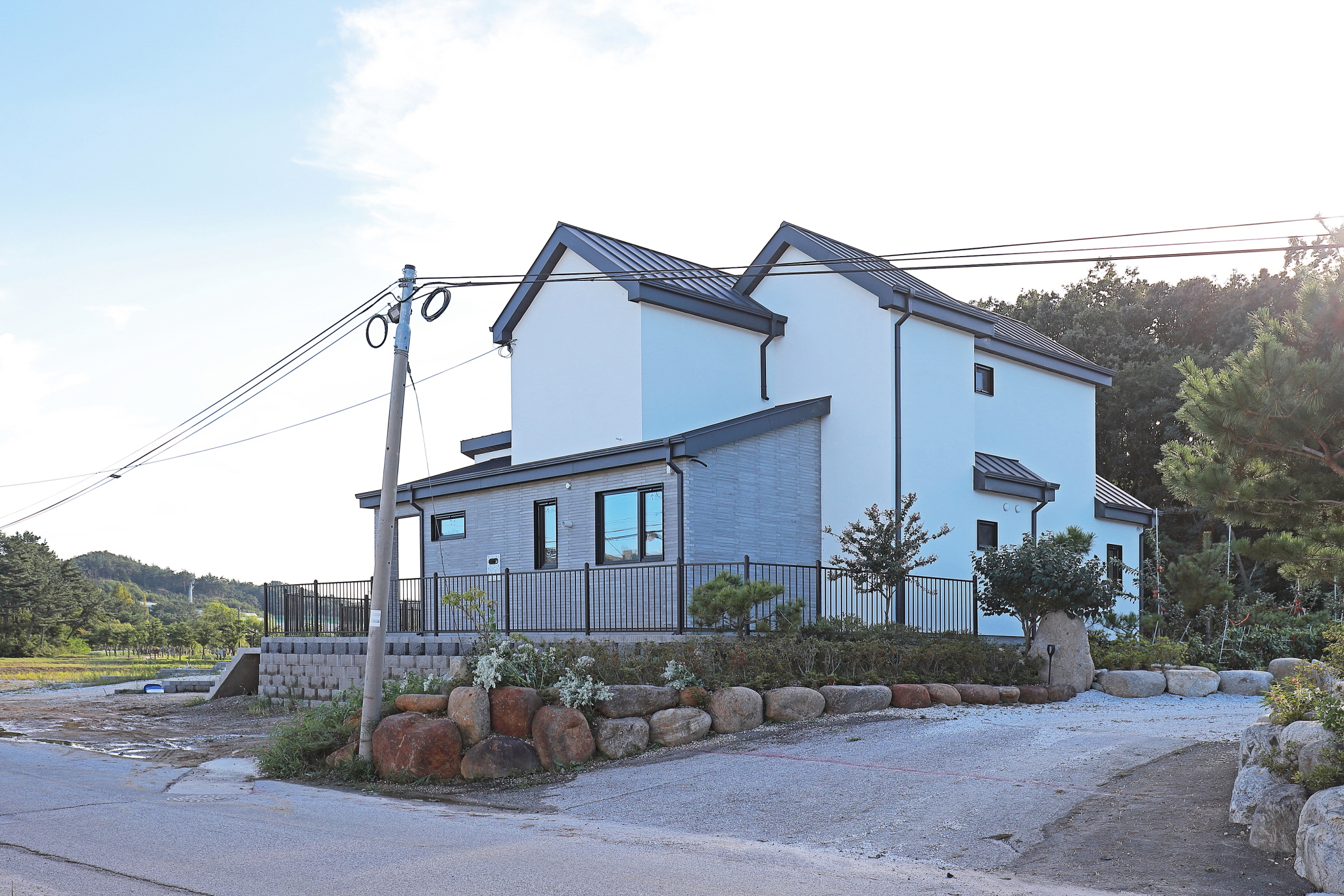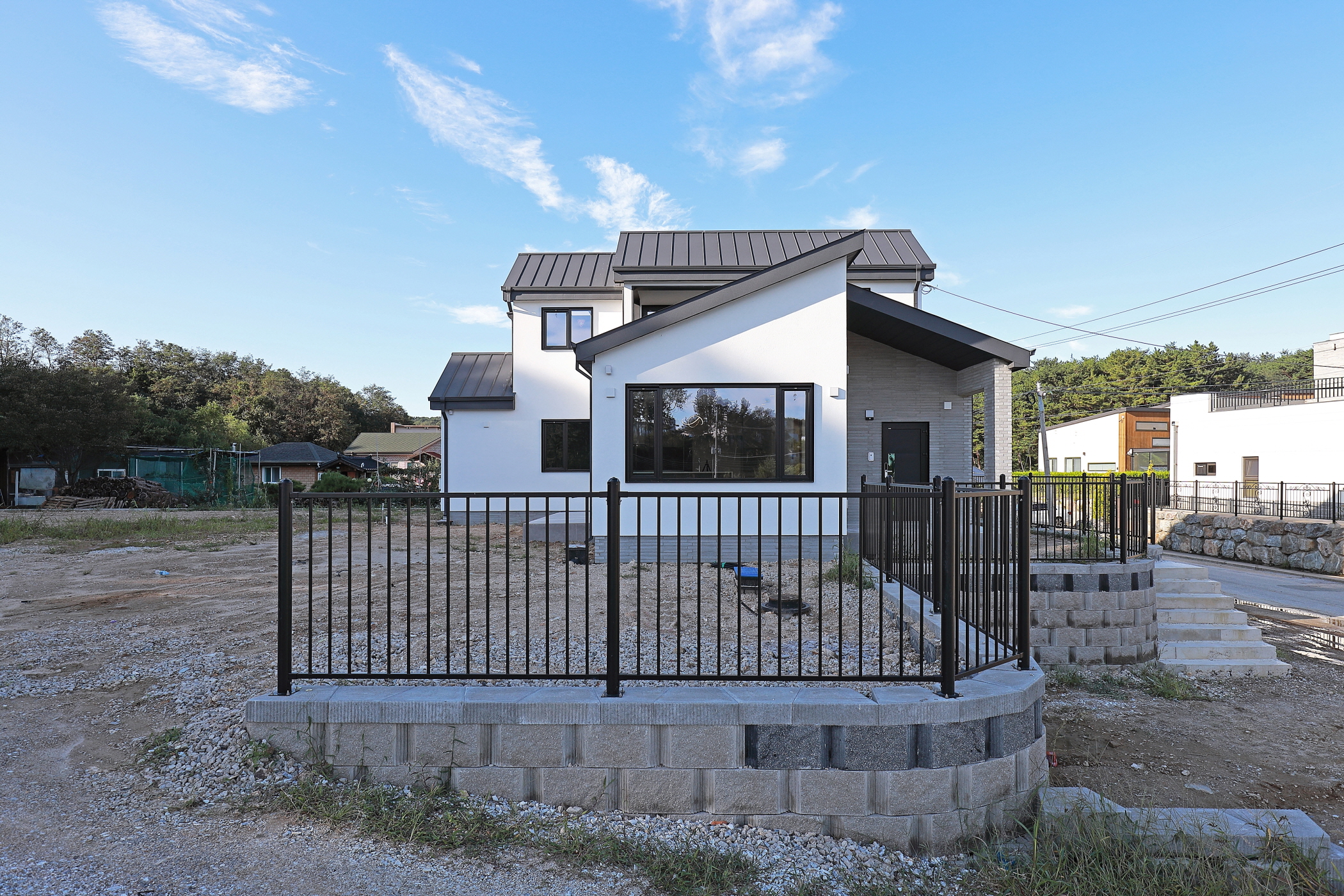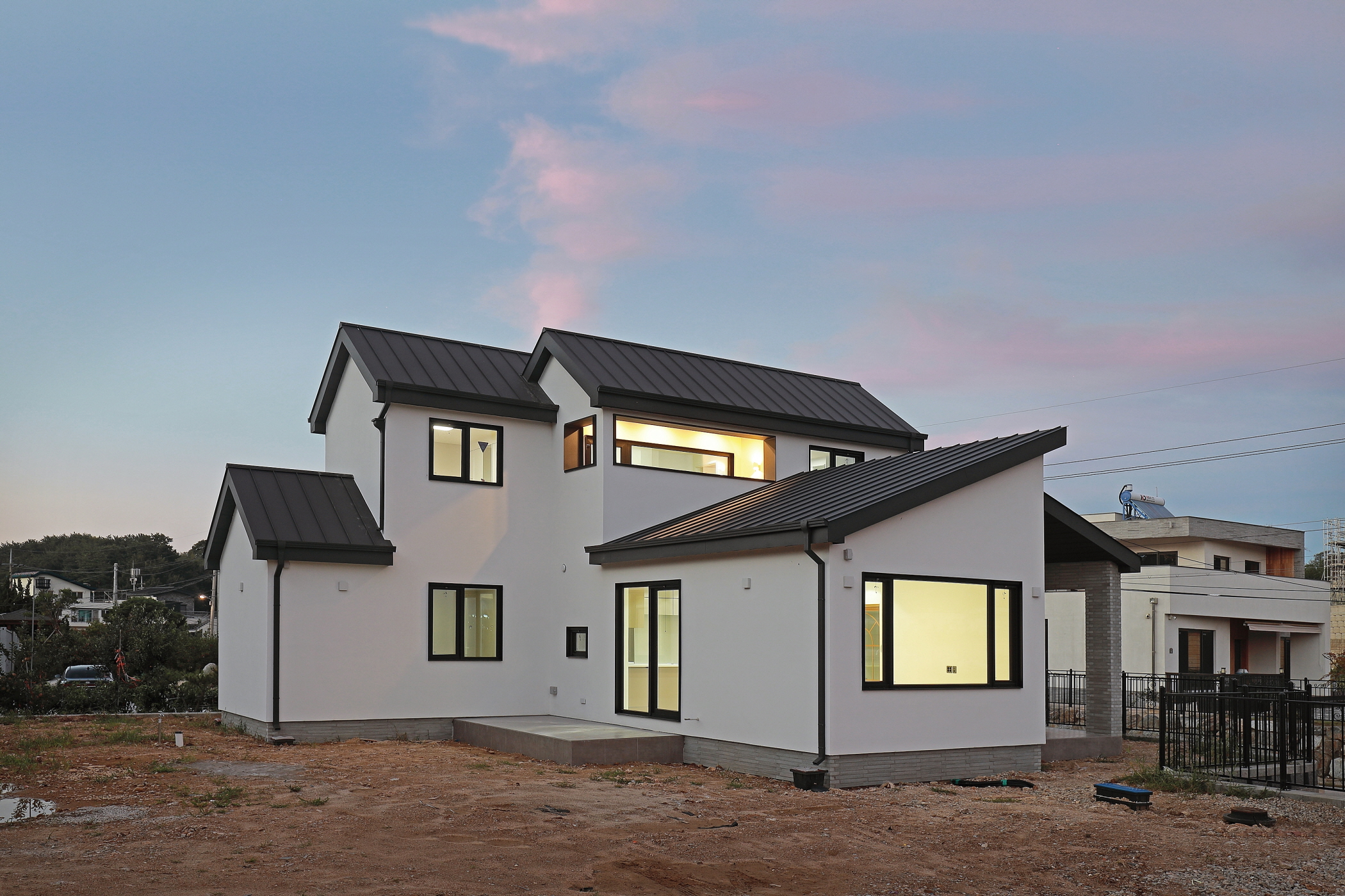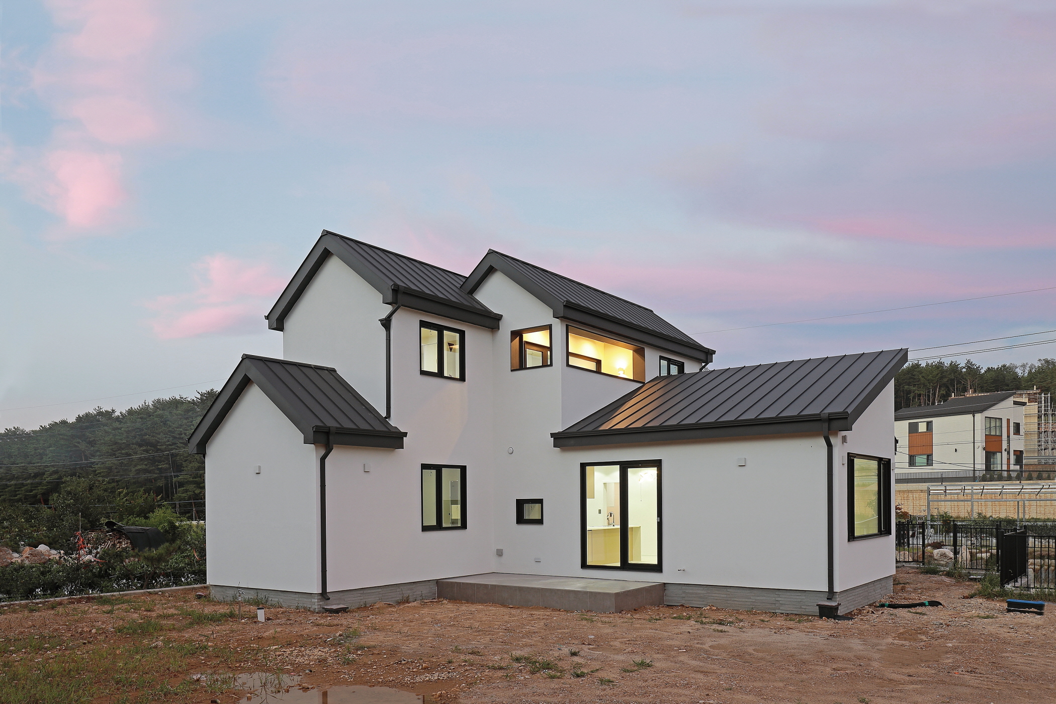 한적한 마을에 건축된 45평 2층 목조주택으로 외부재 스타코플렉스, 롱브릭타일, 지붕은 징크, 시스템 창호를 사용하여 건축된 단독주택입니다. 이 주택에 특징은 지대가 낮아 보강토를 사용하여 토목공사 후 건설 되었으면 욕실에 조족으로 욕조를 만들어서 샤워시 반신욕이 가능합니다. 또한 1층은 부부, 2층은 자녀들이 사용할 수 있게 1층과 2층 공간을 분리하였습니다