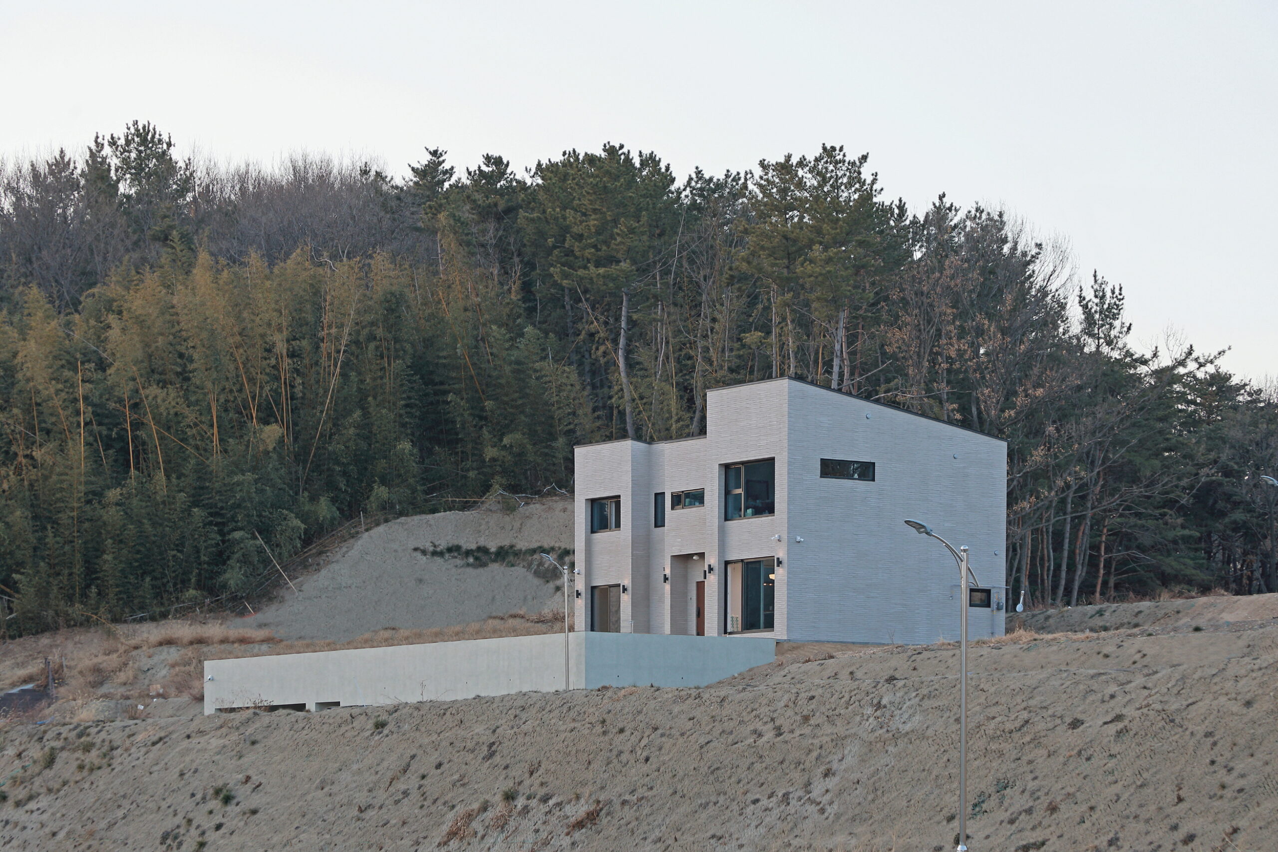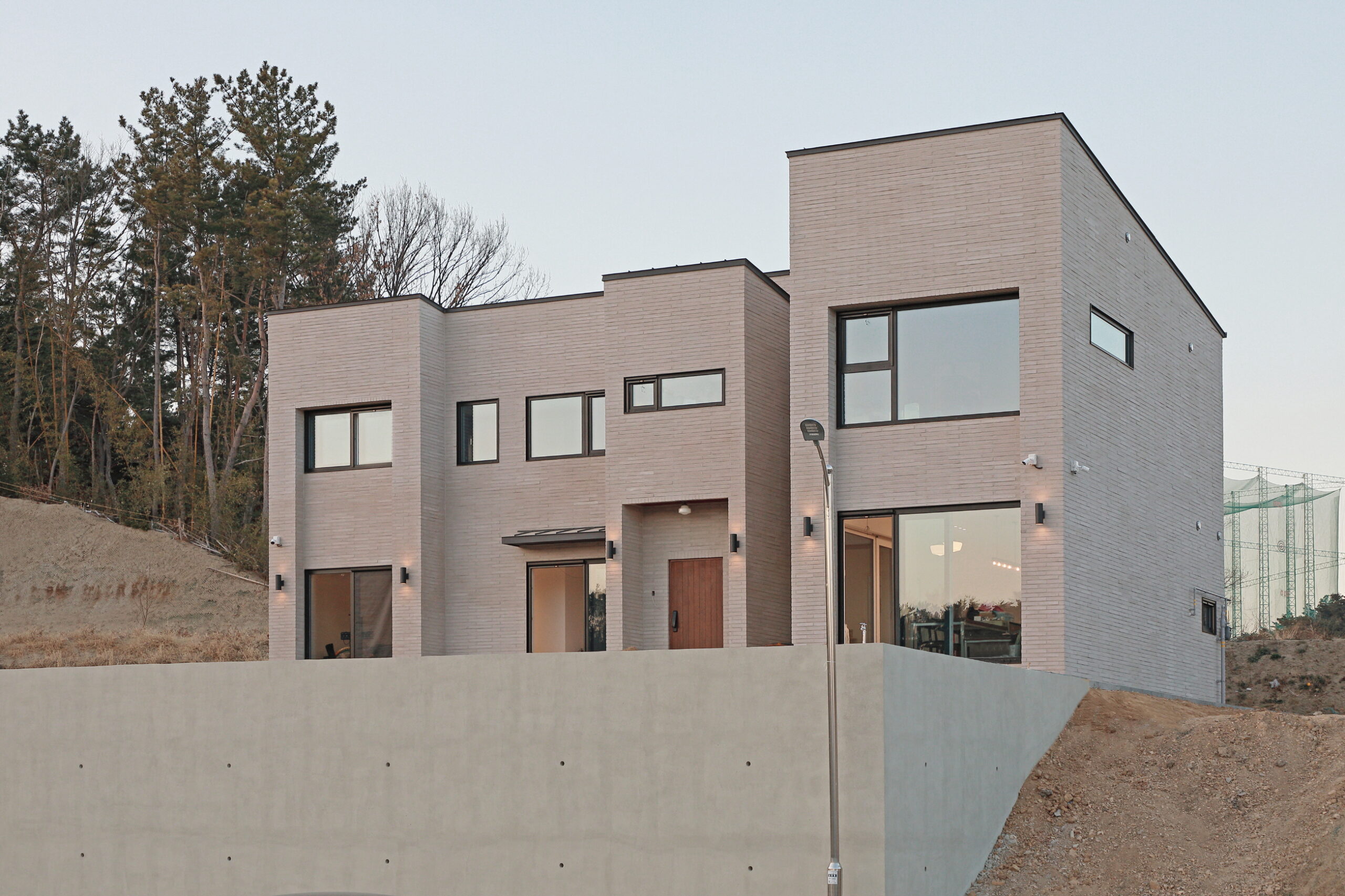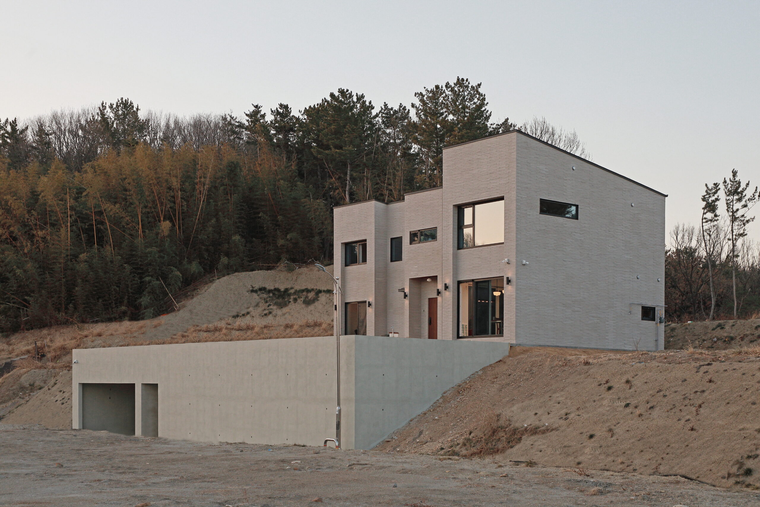단독주택 부지에 건축된 55평 2층 목조주택이며 외장재는 롱브릭타일, 지붕은 징크, 시스템 창호를 사용하여 건축한 모던심플 단독주택입니다. 이주택에 특징은 지하주차장을 건설하여 지하에 차량2대가 주차가 가능하며 지하 주차장위에 공간을 마당으로 넓게 사용이 가능합니다. 또한 내부에 2층과 연결되어 있는 계단을 철제계단으로 주문 제작하여 계단 하부공간을 사용할 수 있습니다 .