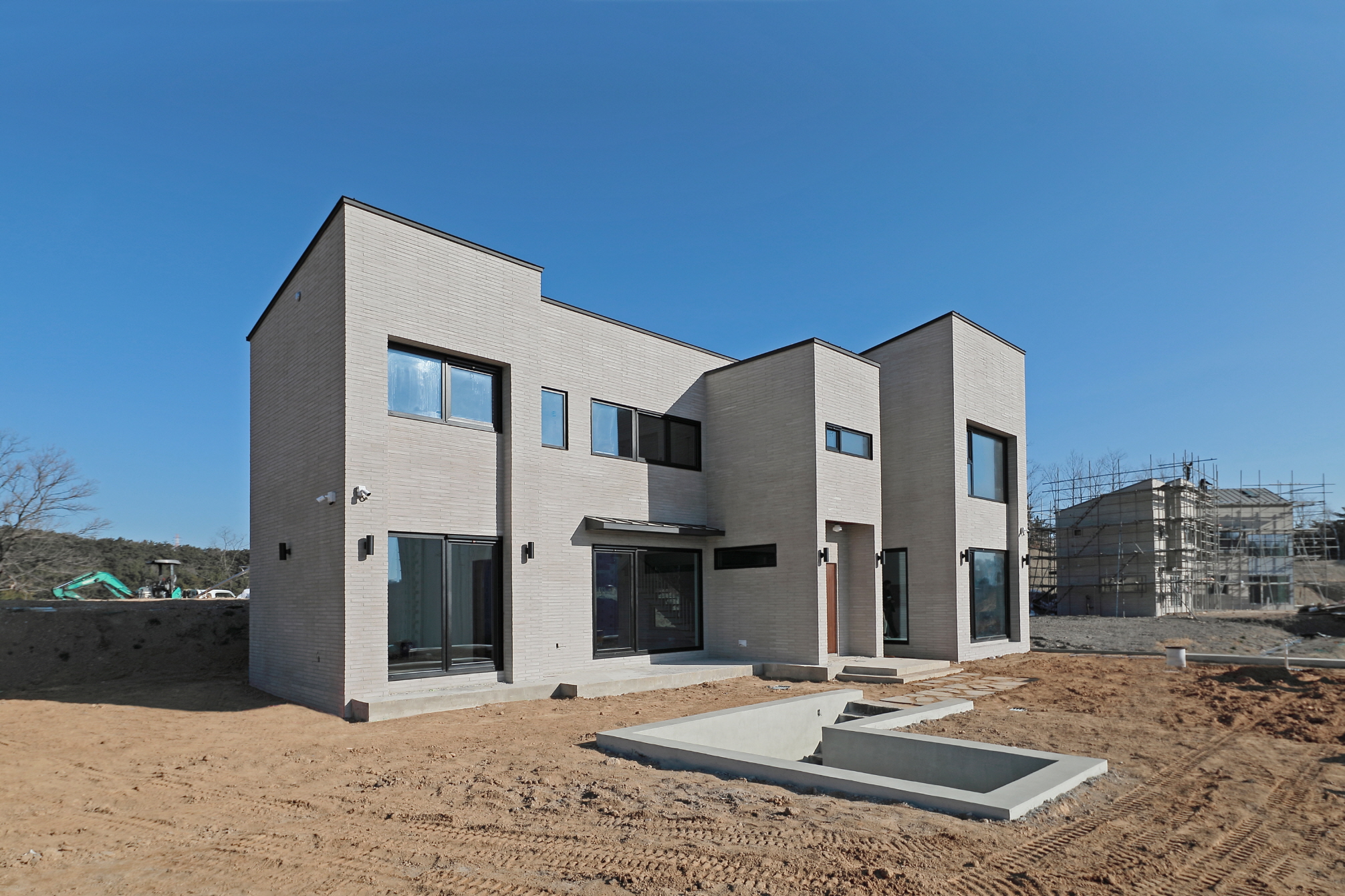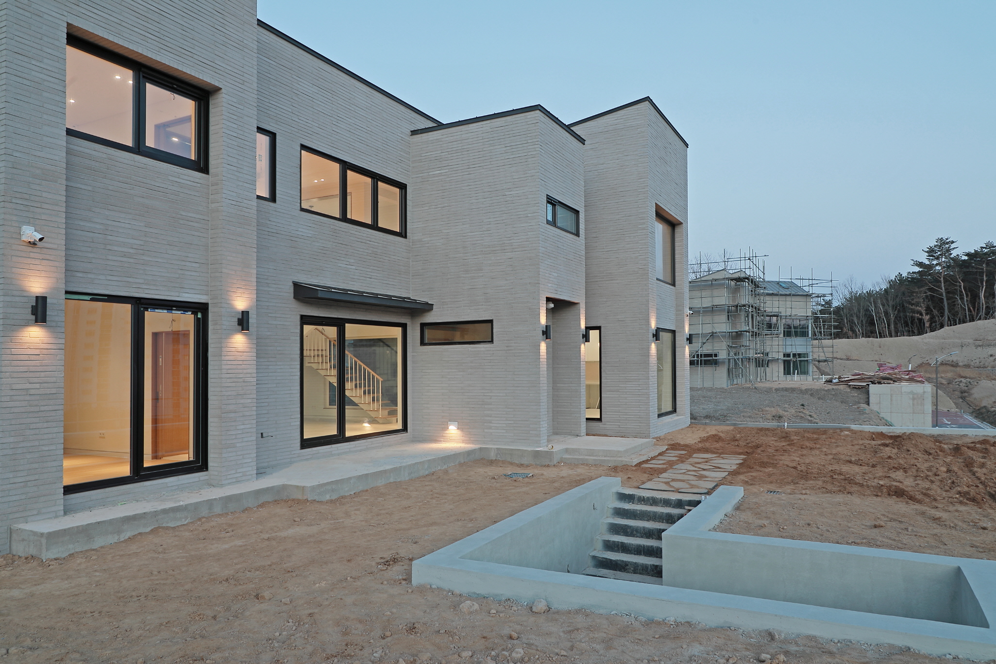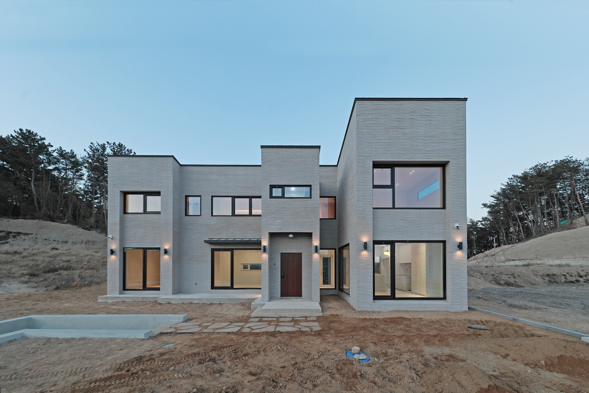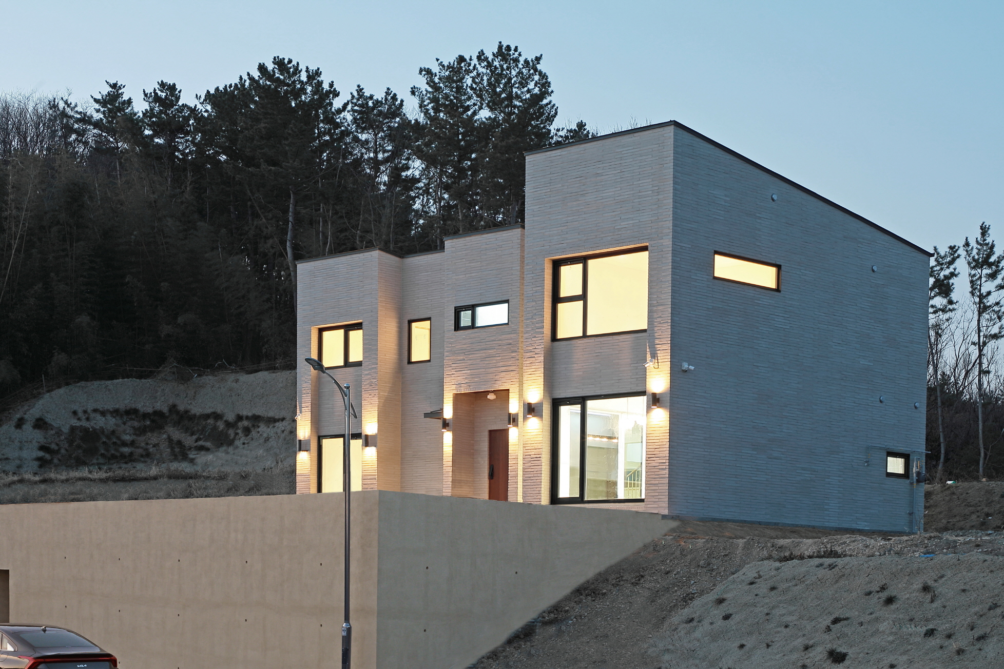 단독주택 부지에 건축된 55평 2층 목조주택이며 외장재는 롱브릭타일, 지붕은 징크, 시스템 창호를 사용하여 건축한 모던심플 단독주택입니다. 이주택에 특징은 지하주차장을 건설하여 지하에 차량2대가 주차가 가능하며 지하 주차장위에 공간을 마당으로 넓게 사용이 가능합니다. 또한 내부에 2층과 연결되어 있는 계단을 철제계단으로 주문 제작하여 계단 하부공간을 사용할 수 있습니다 .